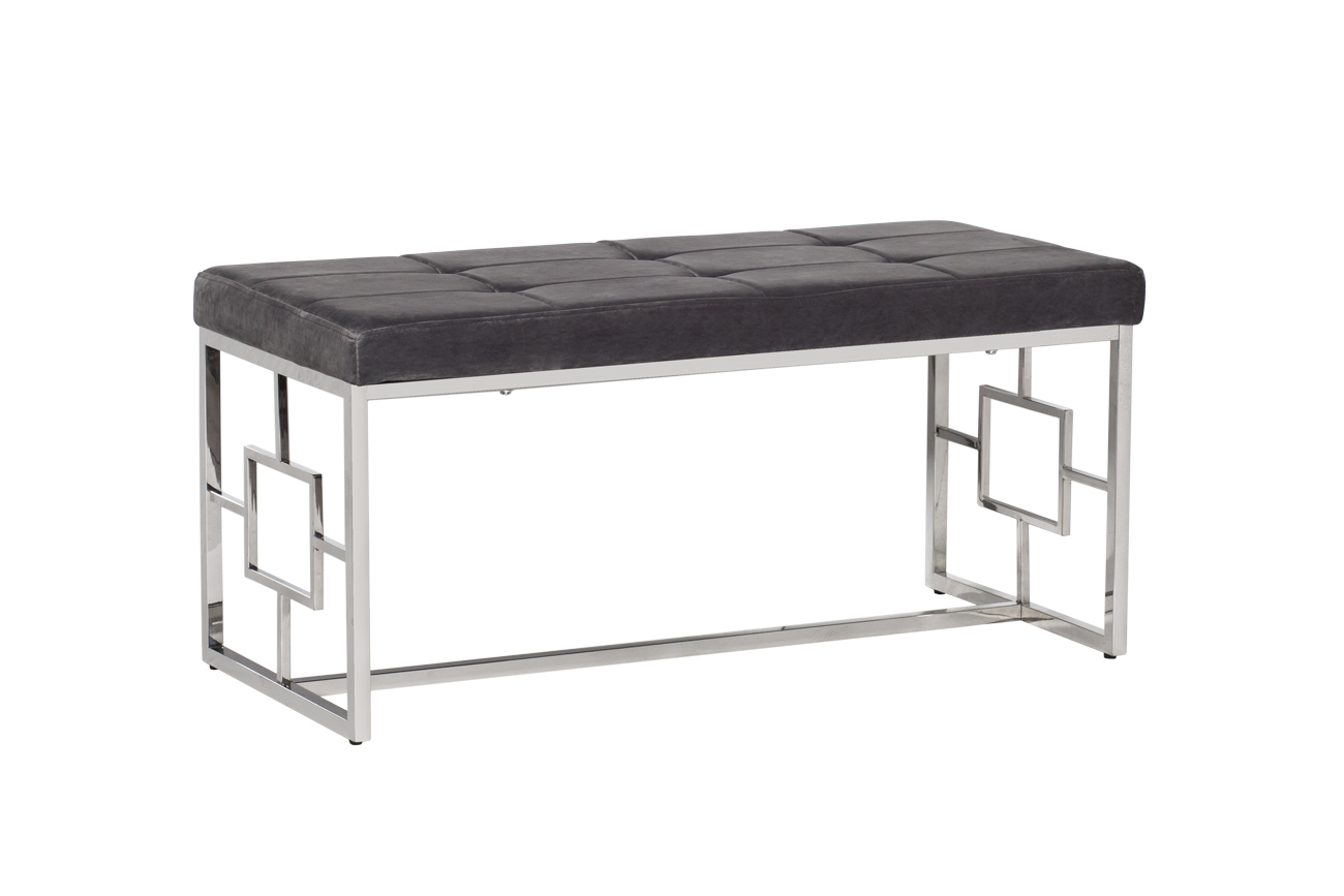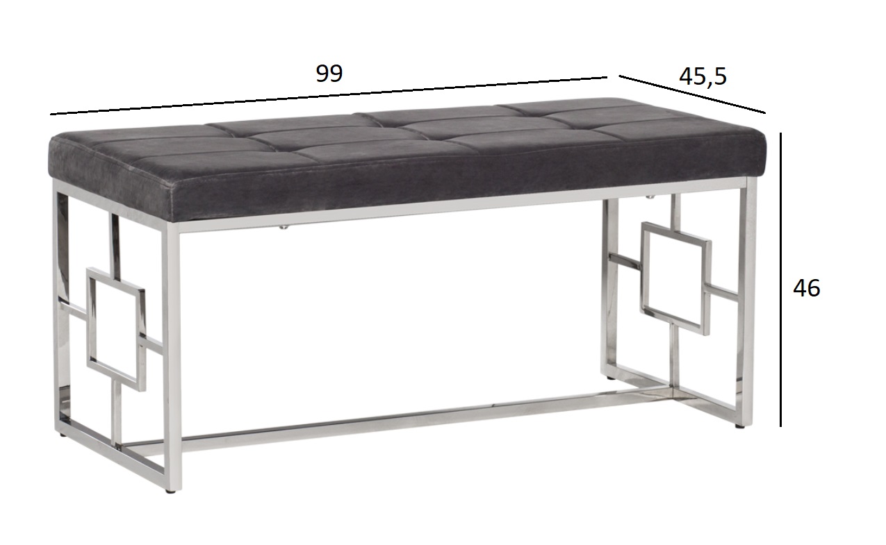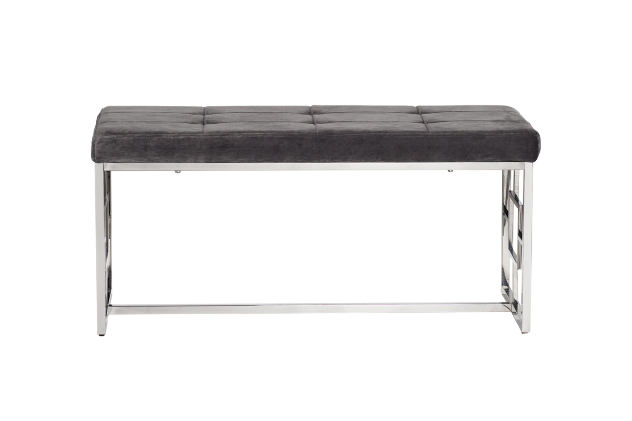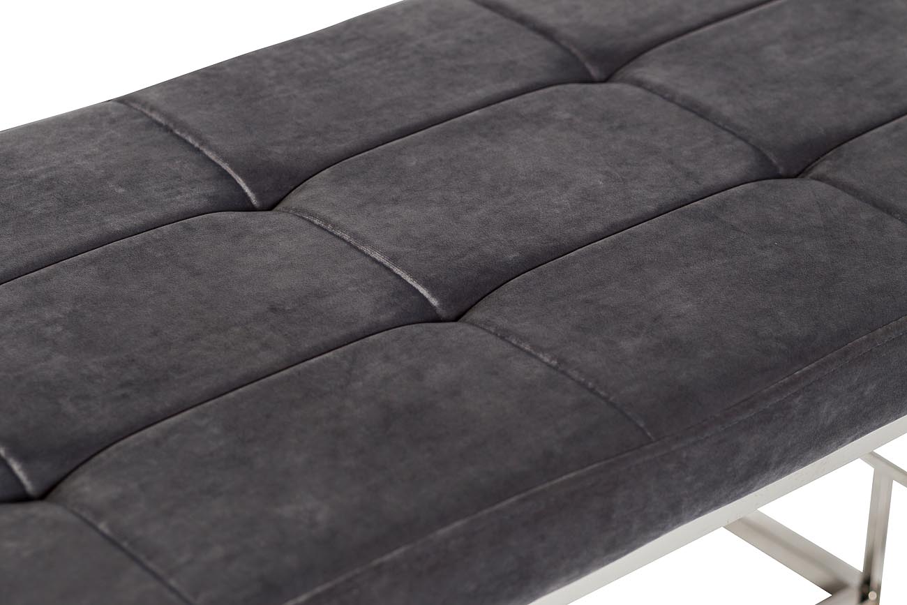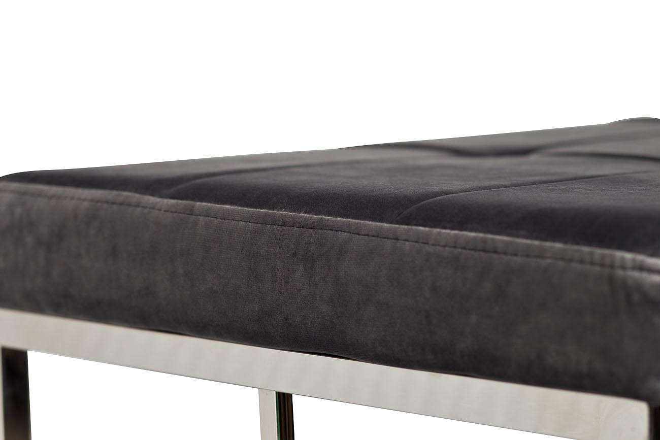 Банкетка из велюра отличаются прочностью и долговечностью. Обивка элегантного светло-серого цвета позволяет вписать ее практически в любой интерьер. Изящество и простота конструкции из полированной стали делает банкетку уместным и надежным предметом меблировки как для дома, так и для офисных помещений.