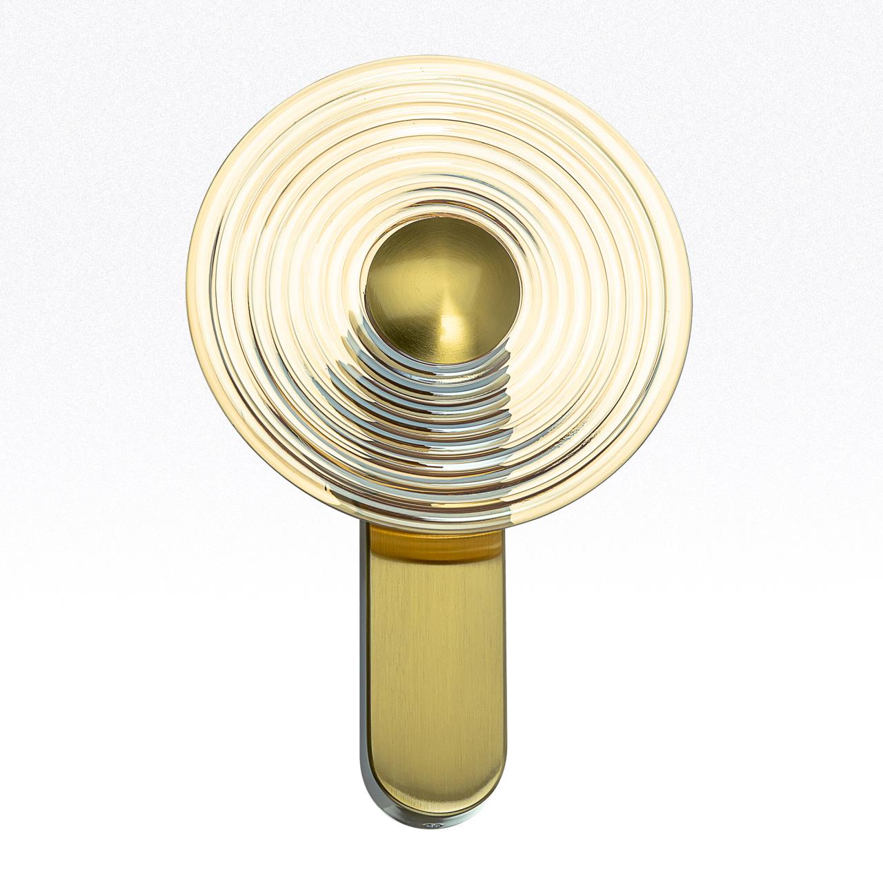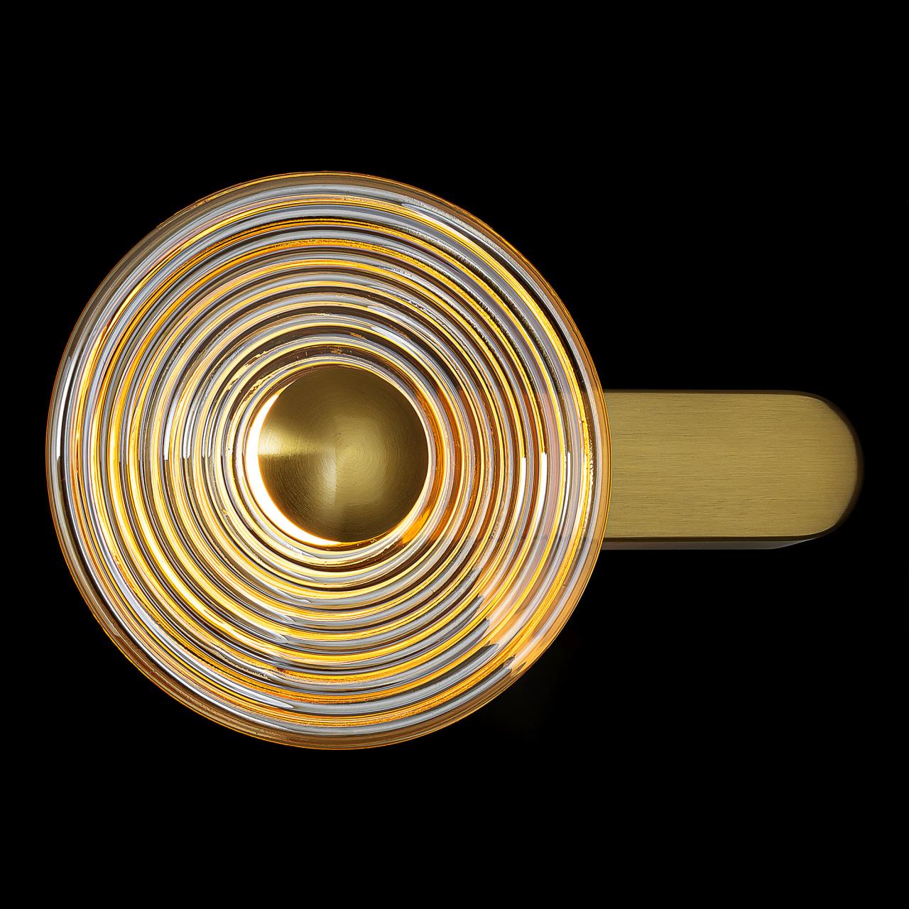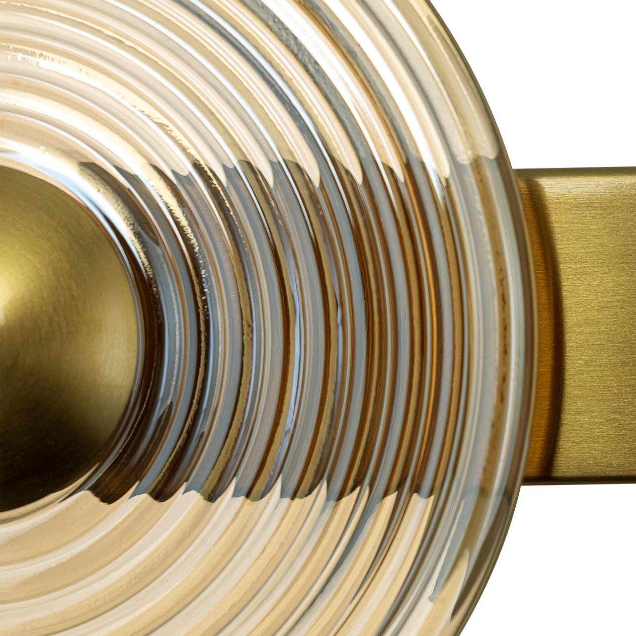 Корпус светильника изготовлен из металлического сплава со стильным бронзовым оттенком. Большой круглый плафон — из прозрачного стекла. Благодаря встроенным светодиодам с цветовой температурой 3000К бра светит мягким, равномерным светом без мерцания и пульсаций. Общая мощность светильника — 7Вт.