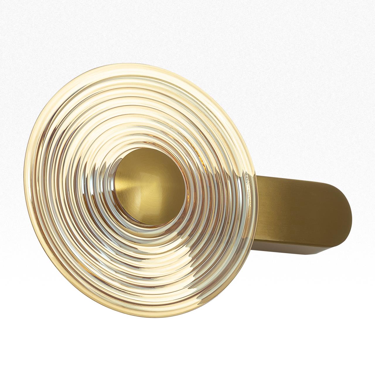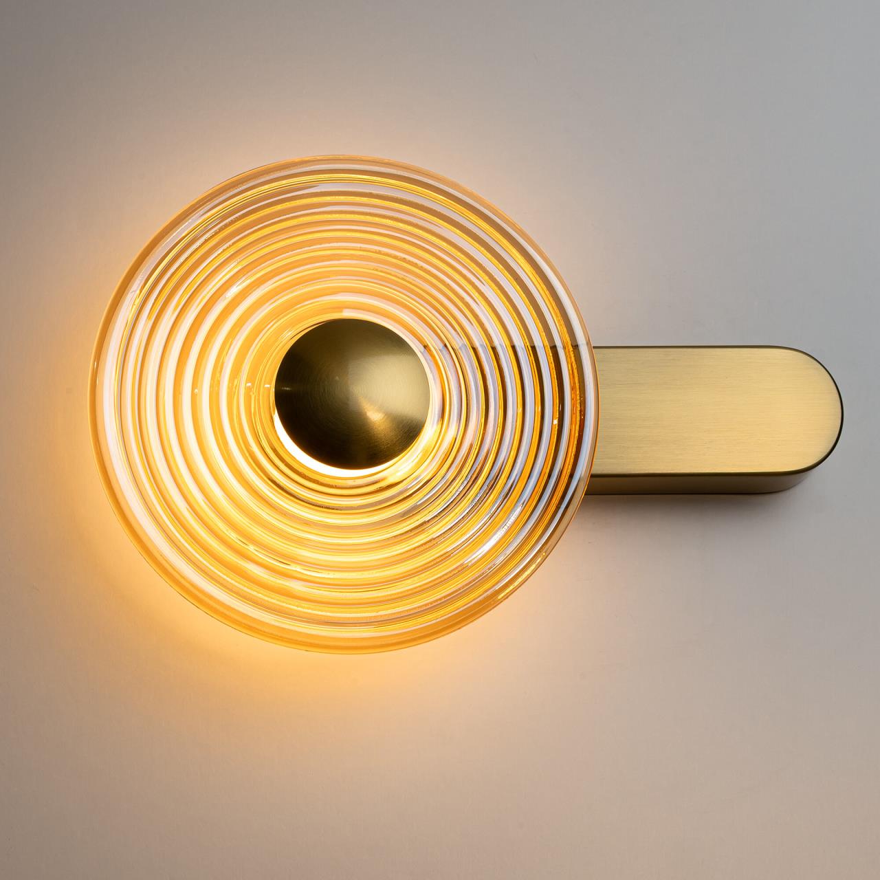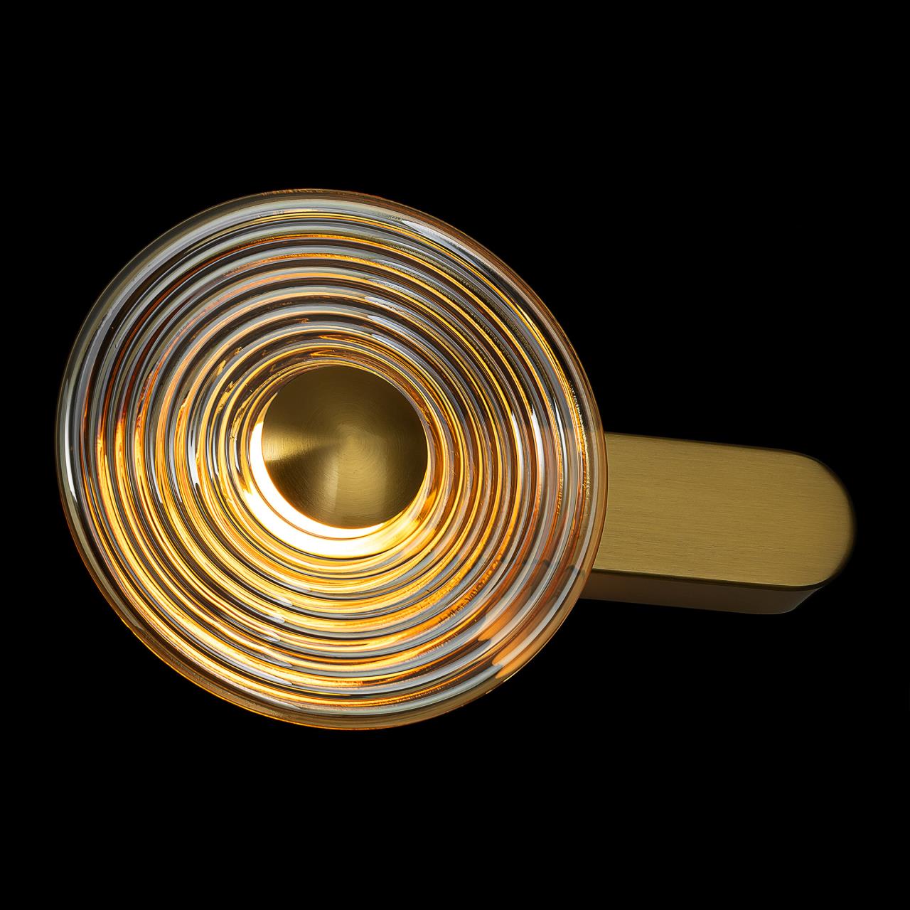Корпус светильника изготовлен из металлического сплава со стильным бронзовым оттенком. Большой круглый плафон — из прозрачного стекла. Благодаря встроенным светодиодам с цветовой температурой 3000К бра светит мягким, равномерным светом без мерцания и пульсаций. Общая мощность светильника — 7Вт.