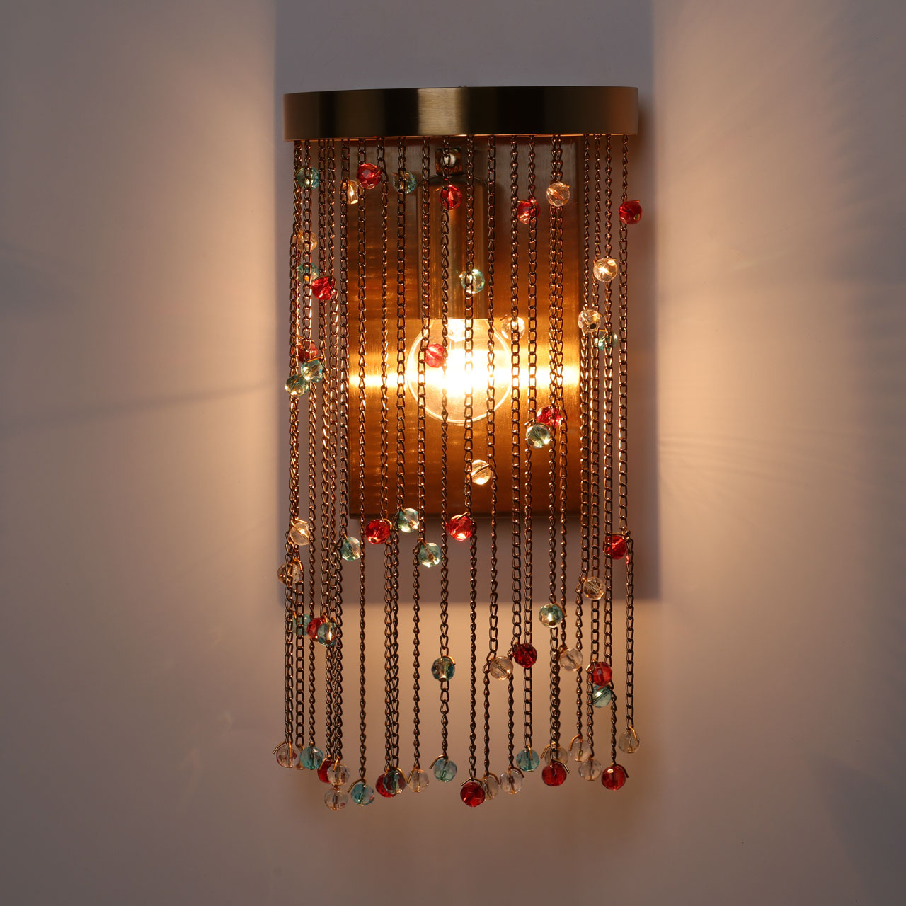 Металлическое основание настенного бра гальванизировано в цвет латуни. Светильник декорирован цепочками, гальванизированными в цвет основания и хрустальными бусинами, окрашенными в массе в голубой и красный цвета и прозрачными.