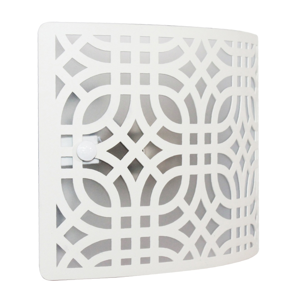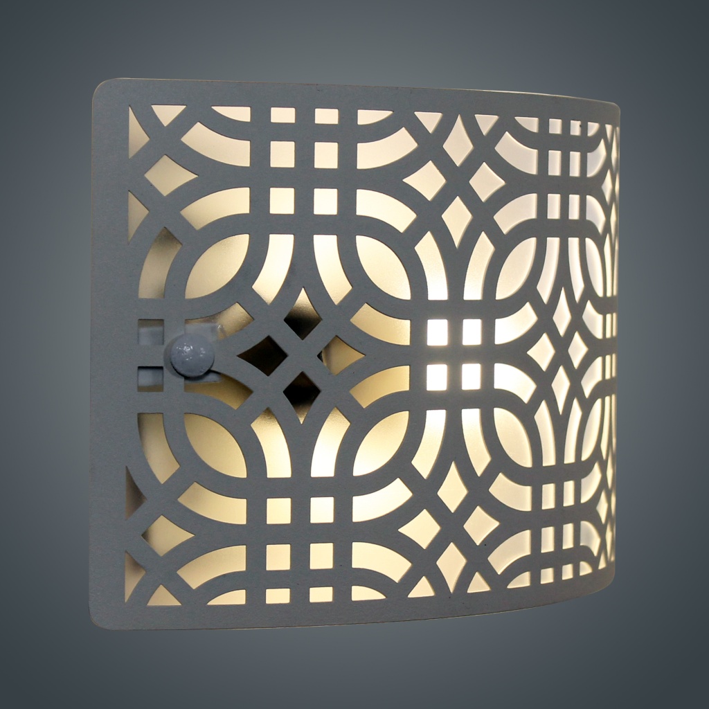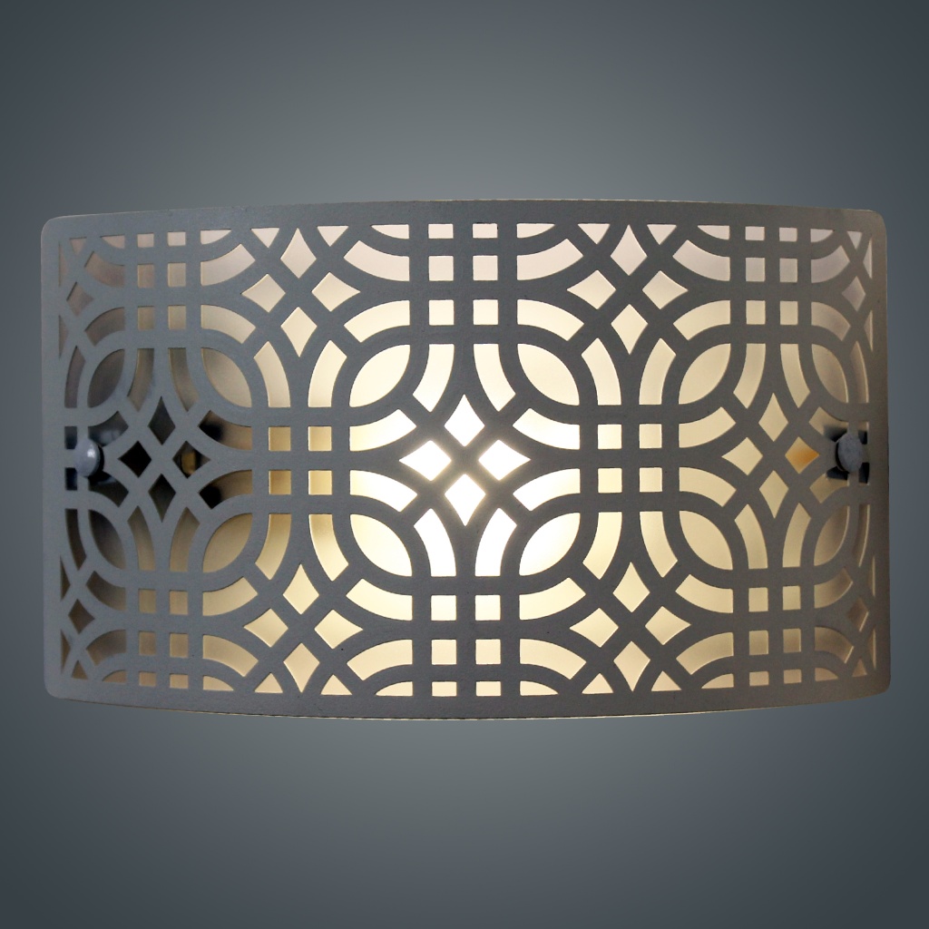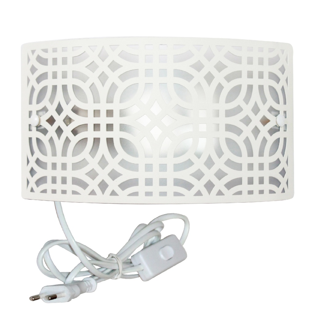 Настенный светильник из коллекции Амина - это прекрасное сочетание дизайна и функциональности. Стальной каркас белого цвета и стальной плафон отлично дополнит интерьер любого помещения. Настенный светильник с плафоном из металла вырезанным с помощью лазерного станка осветит помещение площадью 3 кв. м. Рекомендуем использовать для устройства лампы накаливания с цоколем E27 и мощностью 60 W. Прибор произведен с использованием материала: металла и пвх пленки . Основным цветом товара является белый . За счет прозрачной подложки светильник мягко рассеивает свет . Данную модель 1005405252 спешите купить в интернет-магазине 220svet.