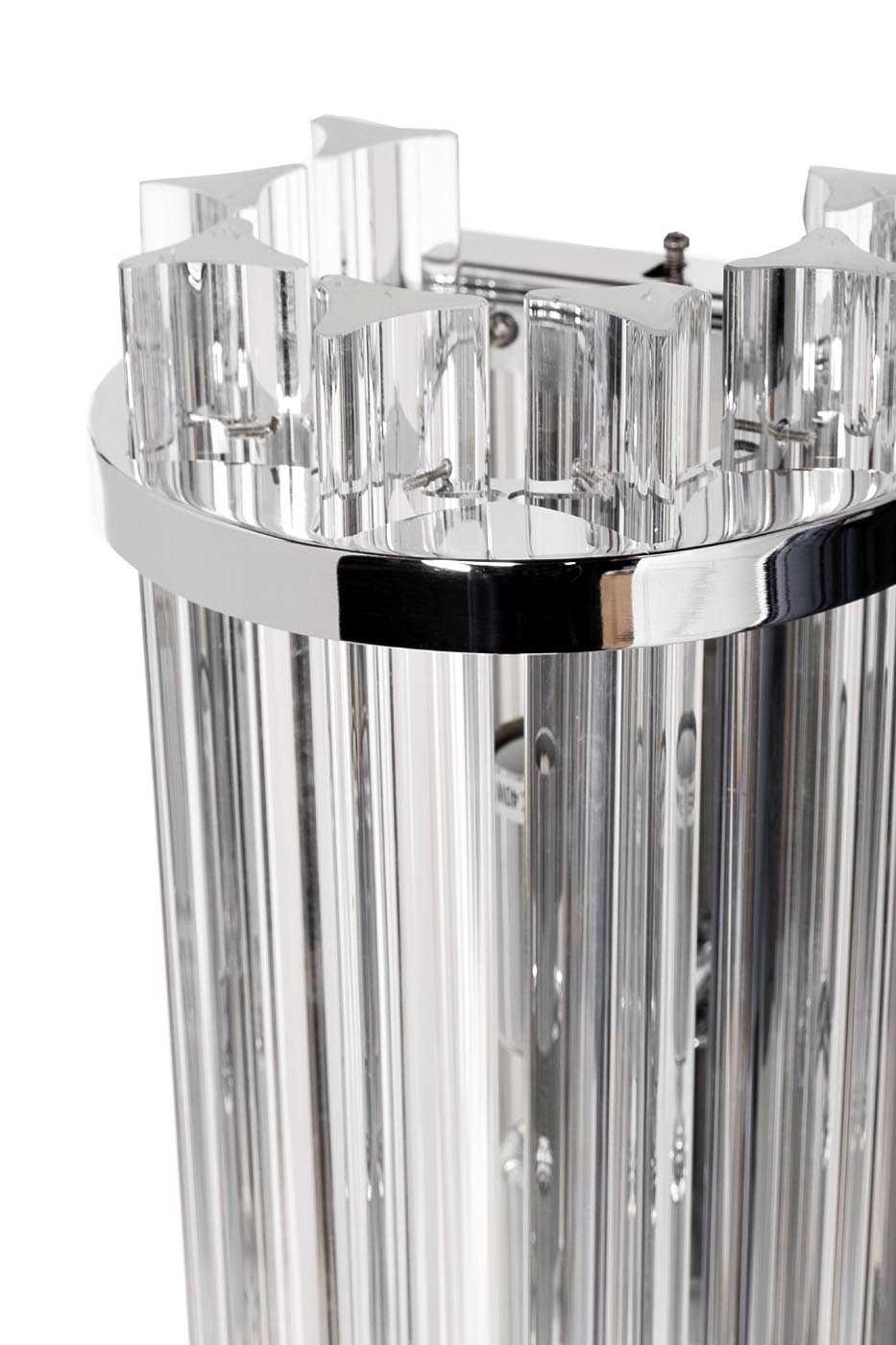овременное настенное бра выполнено из стеклянных палочек, которые полностью прозрачны и располагаются по дуге, что изумительно рассеивает свет по всей комнате. Они крепятся на хромированном кронштейне, который выполнен из нержавеющей стали. Стеклянное бра – простой, но изящный аксессуар, который прекрасно впишется в любой современный интерьер – от классического до фьюжн. Светильник бра можно установить в спальне, зале, гостиной, рабочем кабинете, столовой. Мягкие световые переливы создают атмосферу уюта, спокойствия. Стоит расположить бра на стене возле кресел, дивана.