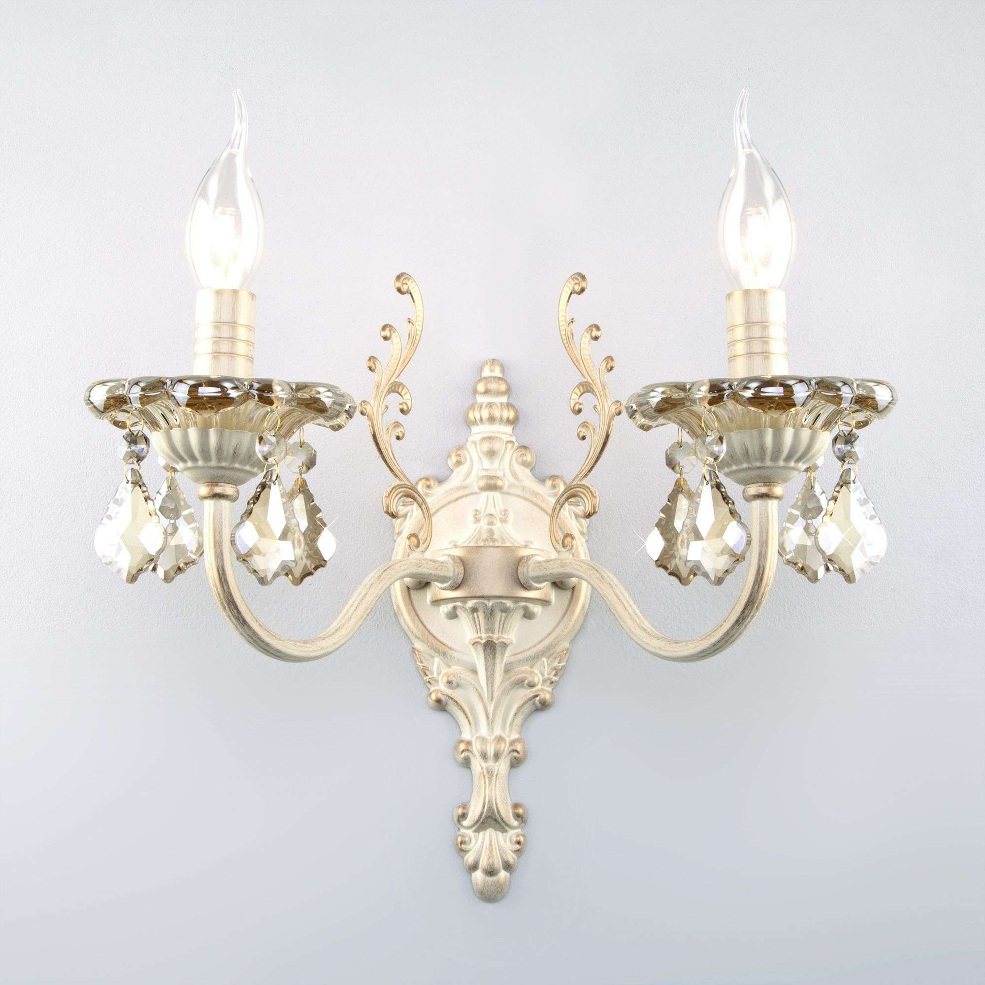 Бра с тонированным хрусталем 3281/2 белый с золотом / тонированный хрусталь двухрожковый станет ярким световым акцентом в классических интерьерах и создаст качественное освещение на площади 4 м². Эффектные чаши подсвечников украшены хрустальными подвесками, которые искрятся в лучах света, наполняя помещение выразительным блеском. В качестве источника света используются сменные лампы типа свеча на ветру с цоколем E14. Патрон рассчитан на максимальную мощность ламп накаливания 60 Вт.