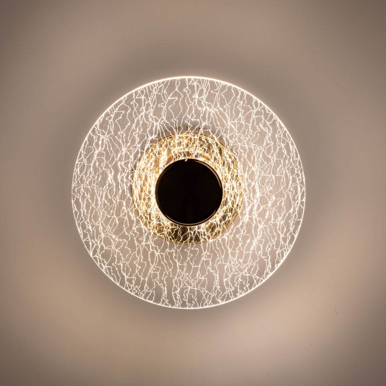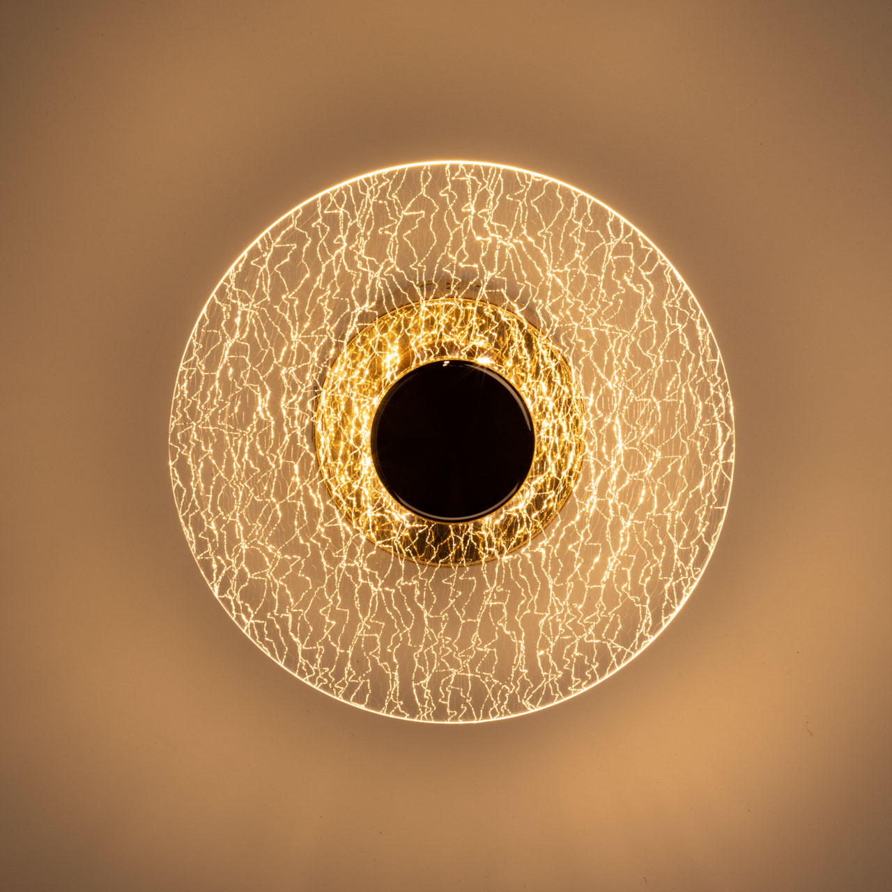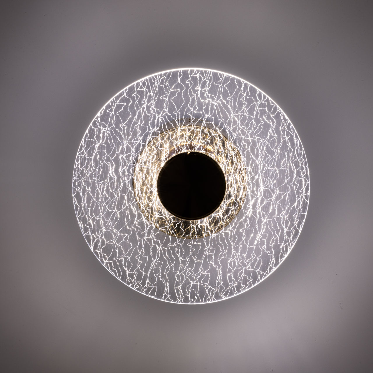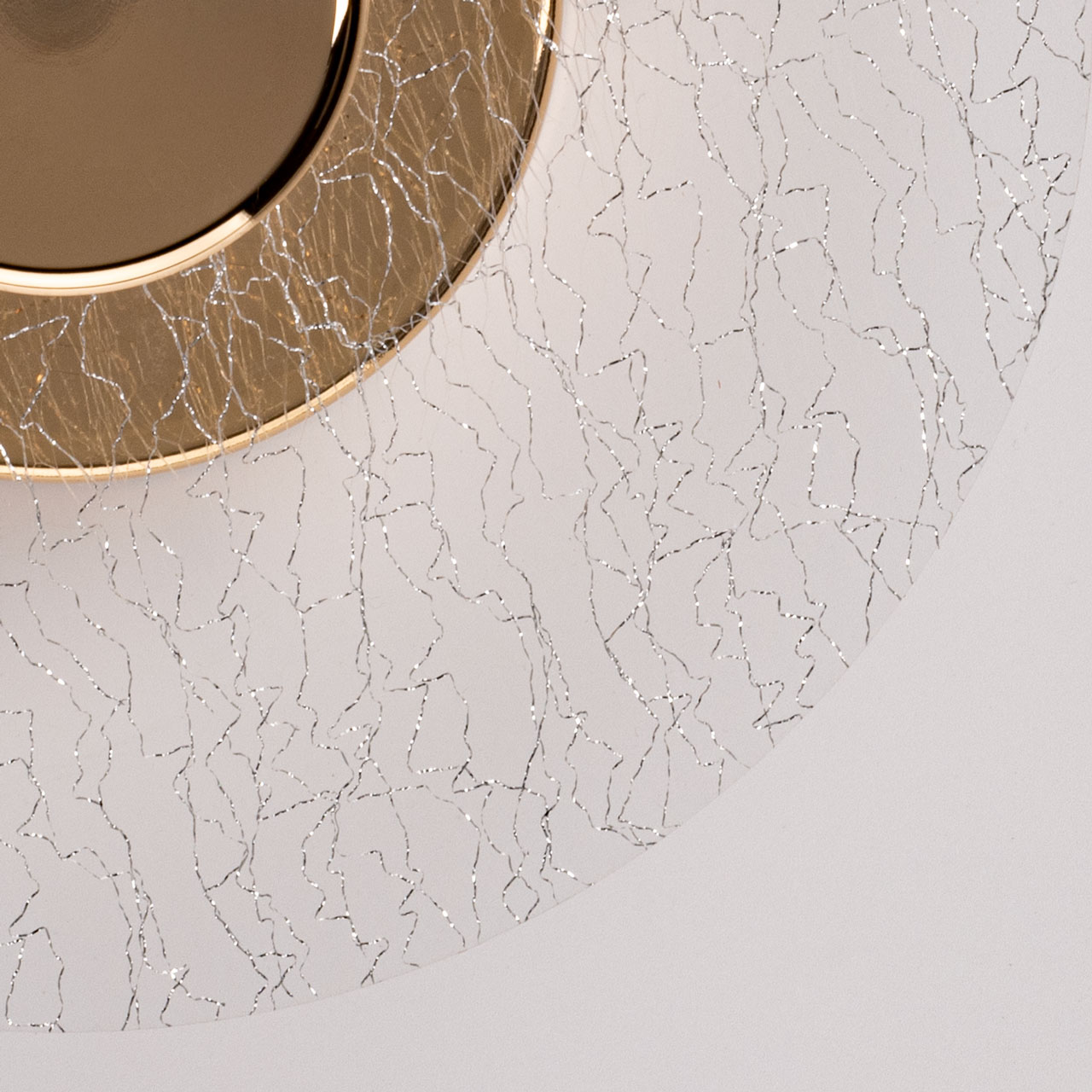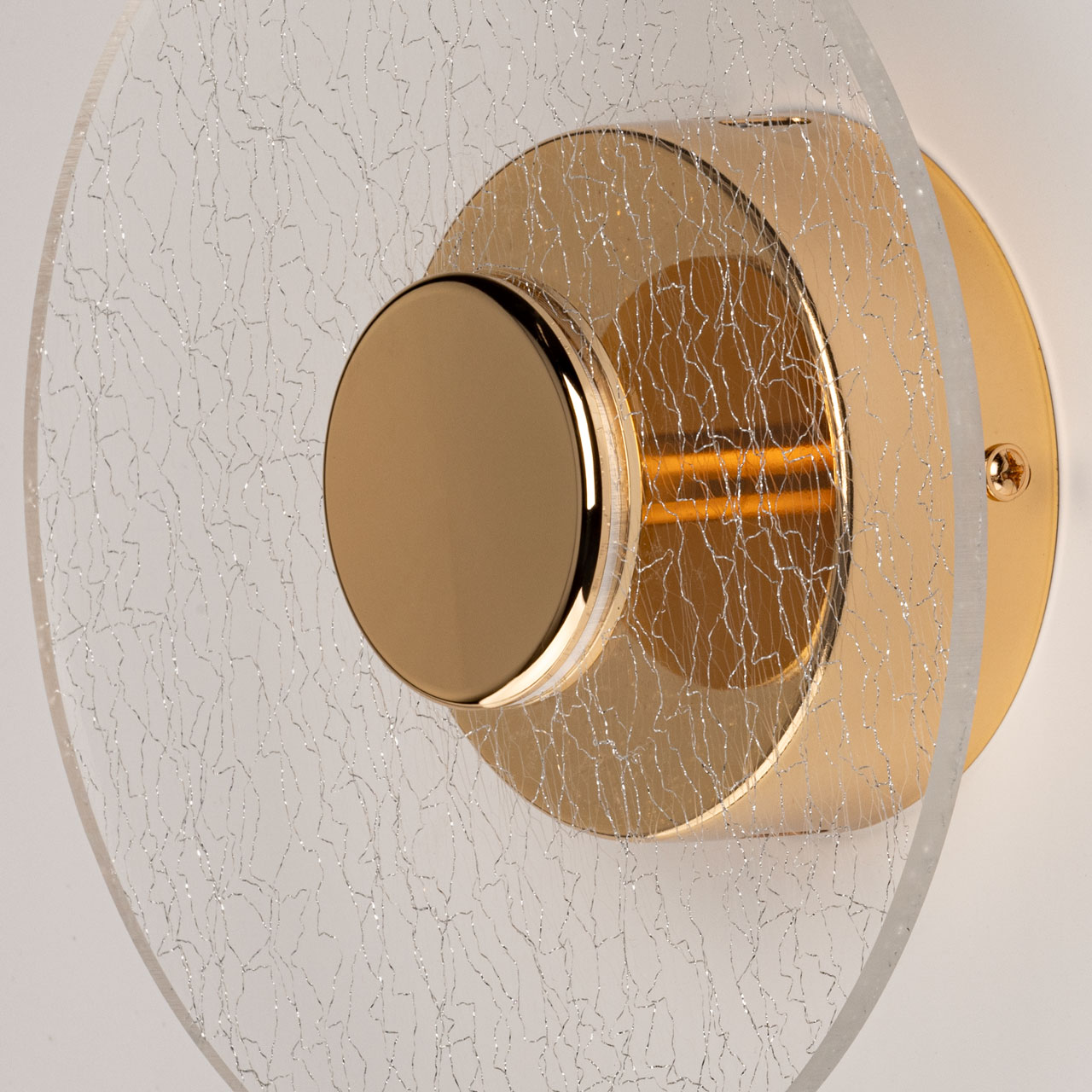 Металлическое основание настенного бра гальванизировано в цвет золота. Основа плафона выполнено из сплава алюминия с цинком и гальванизировано в цвет основания. Настенное бра декорировано плафоном из прозрачного фактурного акрила.