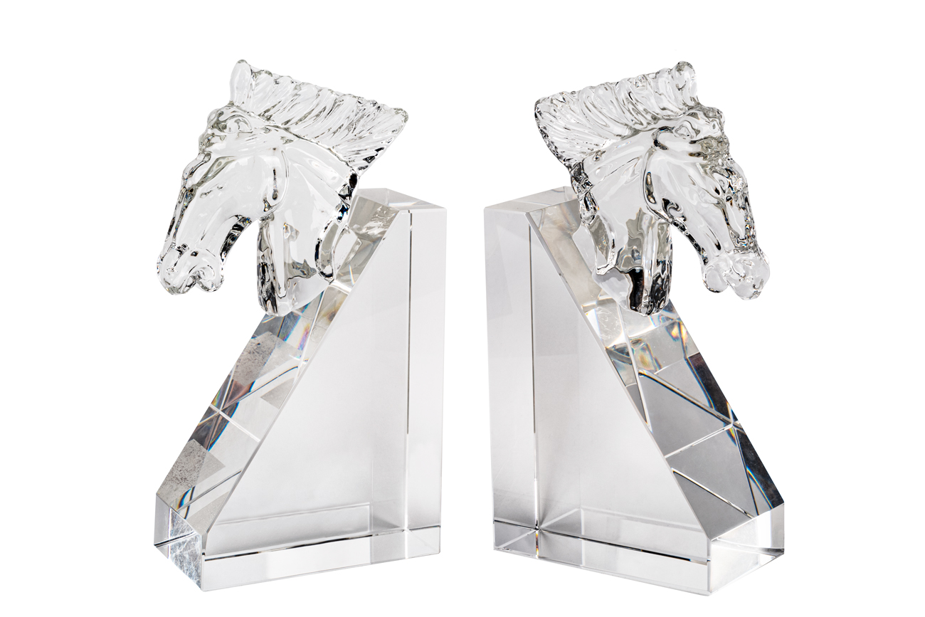 Изысканные держатели для книг из отического стекла станут роскошным украшением кабинета или гостиной, оформленной в стиле ар-деко. Подставки из прозрачного стекла выполнены в виде геометрических призм, декорированных фигурными головами лошадей. Декоративные держатели для книг, выполненные из благородного материала, создают в интерьере атмосферу роскоши и аристократизма. Стеклянные грани, играющие светом, притягивают взгляд и завораживают игрой света.