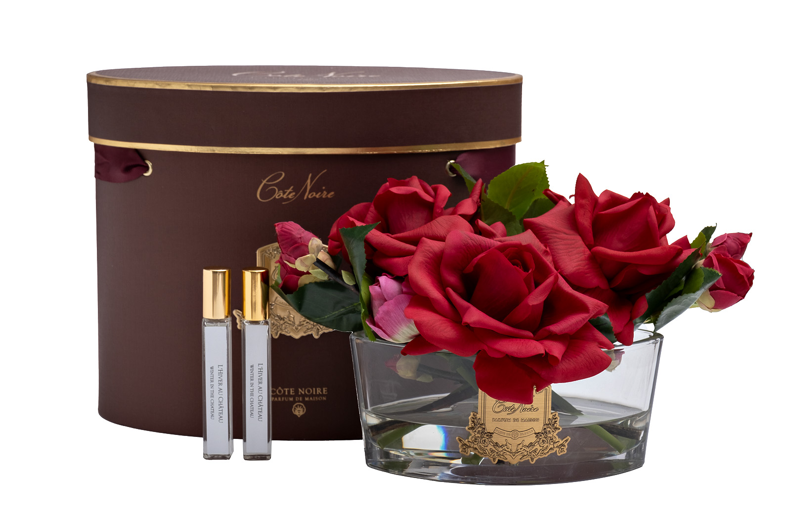 Восхитительные французские ароматы для дома в стиле ар-деко: букет искусственных роз в вазе-стакане, заполненном прозрачным гелем, и парфюмерный спрей Winter in Chatou 2х10мл.
