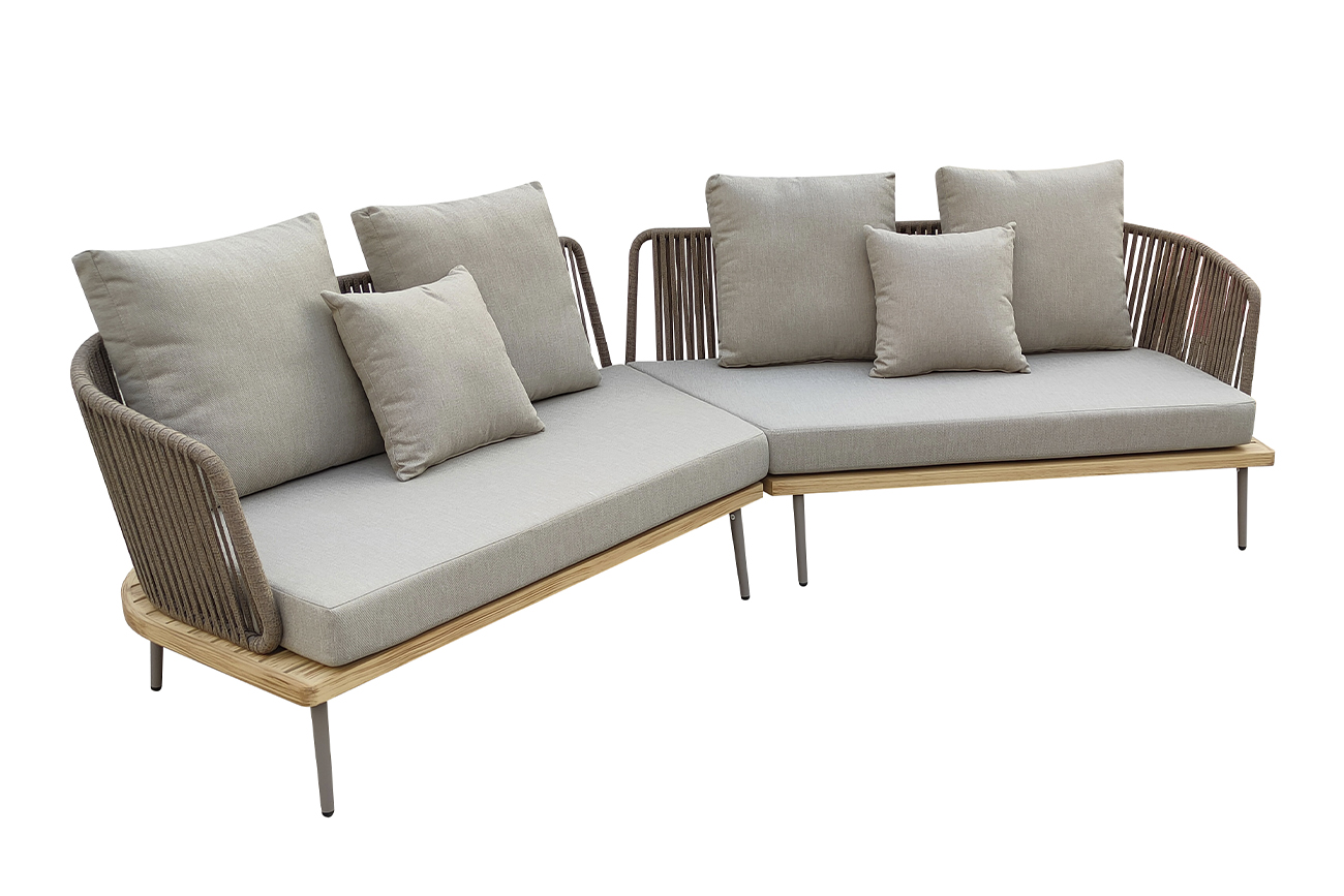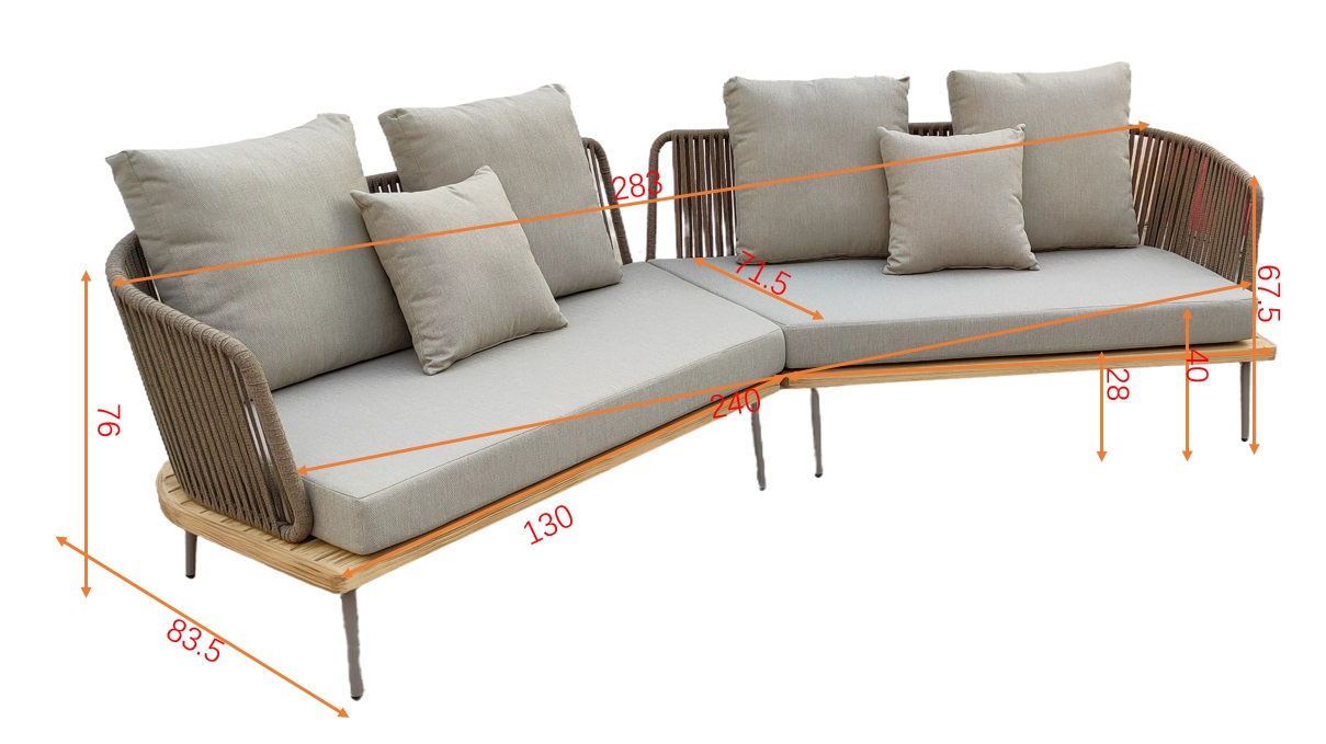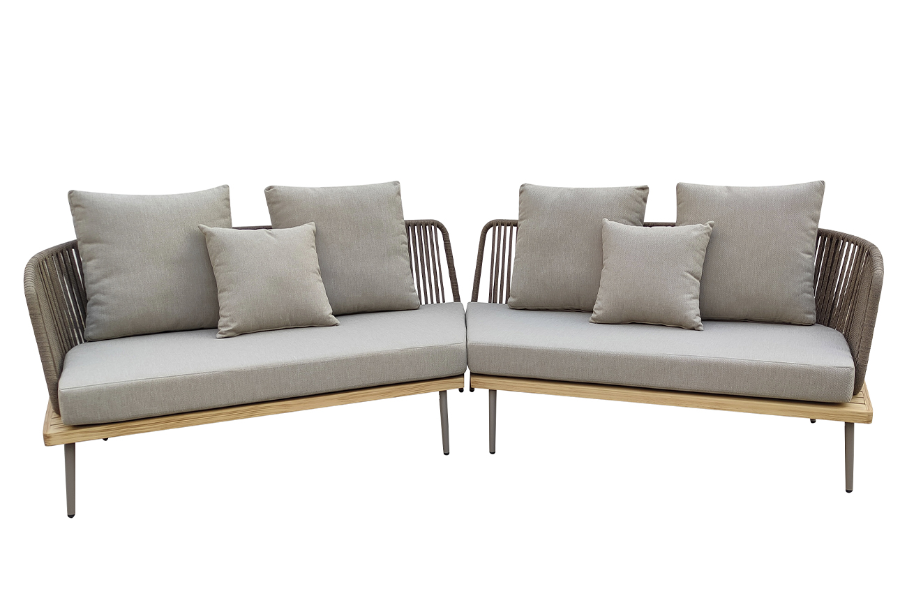 Уличный угловой диван изготовлен из устойчивых к погодным условиям материалов. Cъемные подушки выполнены из специальной уличной ткани с водоотталкивающими свойствами OLEFIN тайваньского производства. Светлая ткань не будет сильно нагреваться на солнце и выцветать. Каркас из алюминия декорирован в цвет дерева, подлокотники и спинка оплетены декоративным шнуром. Диван состоит из двух частей с внутренней длиной 130см каждая, соединенных под углом. В комплект входят 2 подушки сиденья 12см, 4 подушки спинки и 2 декоративные квадратных подушки. Габариты сиденья: ширина 240см, глубина 71,5см, высота от пола 40 см, высота подлокотников от сиденья 27см. Сочетается с уличным креслом 129KN-03041, диванами 129KN-03046, 129KN-03047 и кофейными столиками 129KN-01430, 129KN-00620.