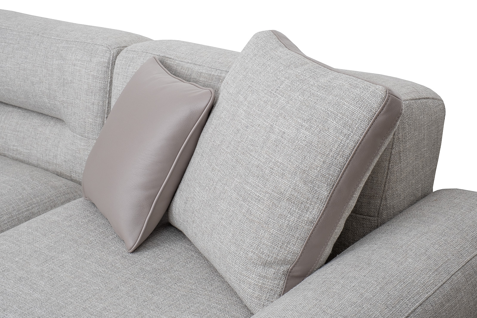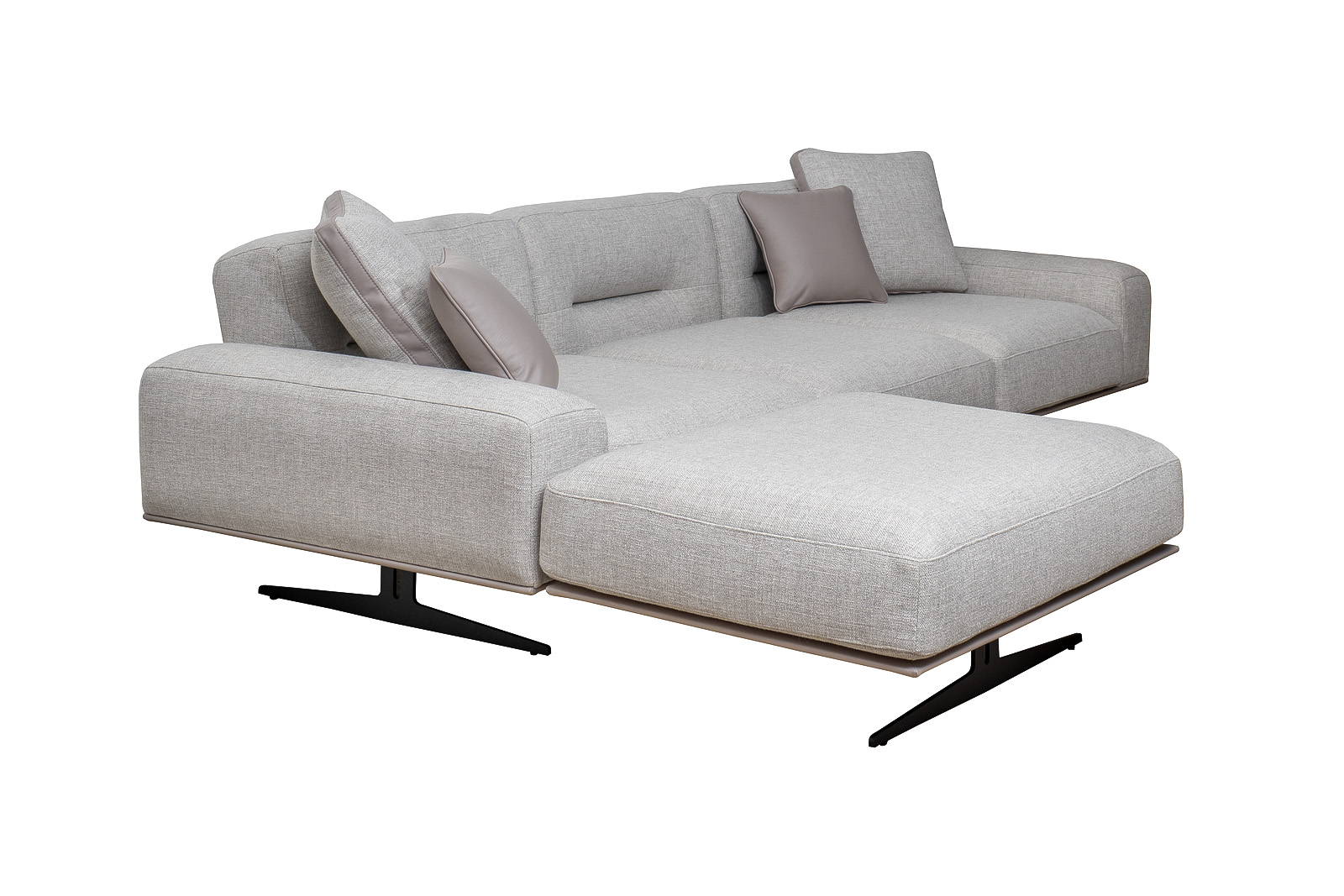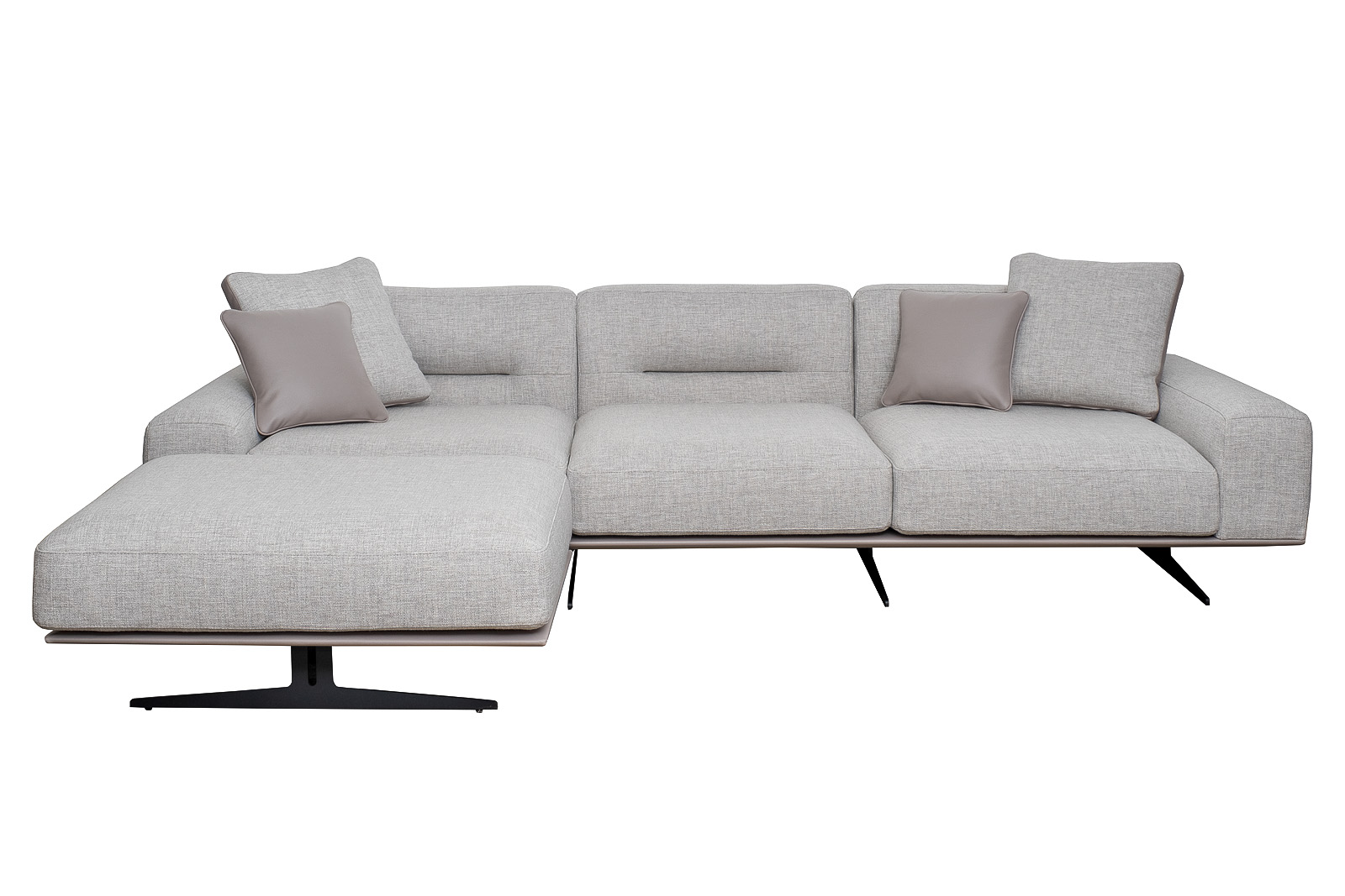 Комплект мебели №11 диван модульный PORTO (левый угол). В состав комплекта входит: основание трехместное-1шт, выполнена в иск.коже Enzo902; подлокотник низкий-2шт; сиденье с высокой спинкой-3шт; отдельностоящий пуф- 1шт. Основная ткань комплекта- рогожка Norton SER из коллекции тканей . В сотав комплекта входят декоративные подушки: 50*50см с бурлетом 2шт- в ткани Norton SER. бурлет- иск.кожа Enzo902; 40*40см с кантом 2шт- в иск.коже Enzo 902. Металлические опоры- 170см, цвет черный. Габариты комплекта: ширина-294см, глубина- 194см, высота-75см. Глубина пуфа- 107см, глубина посадочного места- 82см, высота посадочного места- 45см