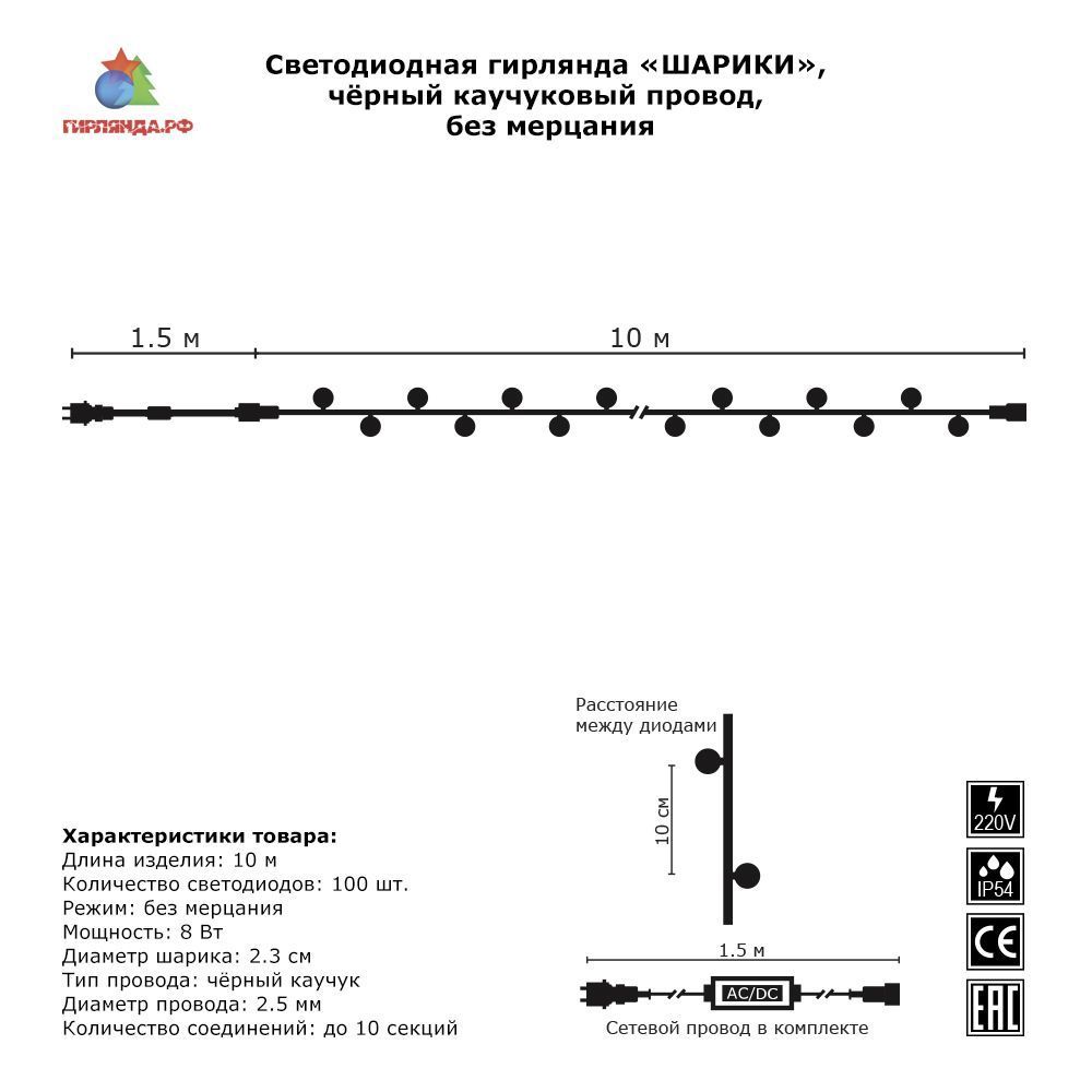 Светодиодная гирлянда 05-1979 ШАРИКИ, диаметр насадки шарика 2,3См.,длина гирлянды 10 метров, 50 Холодных белых + 50 синих, светодиодов в шарике, черный провод (КАУЧУК). Без динамики. Возможность соединения 10 x Используется для украшения новогодних елок. Инструкция по применению: Достать гирлянду из коробки при комнатной температуре, визуально осмотреть на отсутствие повреждений и разрыва провода. Тщательно расправить все провода, при необходимости соединить несколько изделий. Перед монтажом проверить работоспособность изделия подключив его к электросети. Установку изделия производить при температуре воздуха не ниже 0 градусов Цельсия. Меры предосторожности: Внимание! Не подвергать изделие механическим повреждениям. Не прилагать усилий на растяжение и сжатие проводов. Не опускать изделие в воду. Не давать изделие детям. Использовать под наблюдением взрослых и с соблюдением мер предосторожности. Не оставлять гирлянду работающей без присмотра на длительное время. Осуществлять подключение к электрической сети с установленной автоматической защитой: УЗО (устройства защитного отключения).