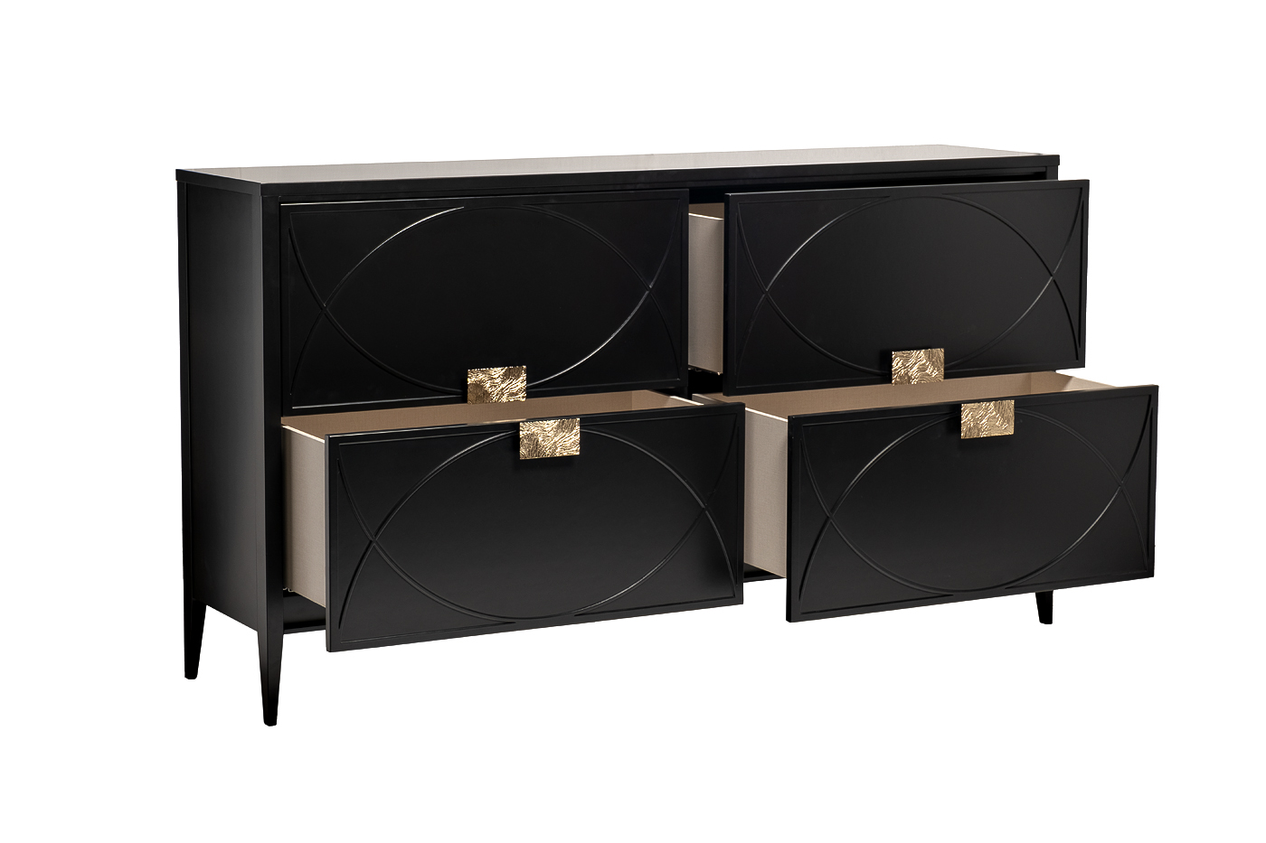 Дизайнерский комод в стиле ар-деко - авторская разработка дизайн-студии Garda Decor. Черный матовый фасад украшен объемным дугообразным декором и широкими рельефными ручками золотого цвета. Четыре выдвижных ящика прекрасно подойдут для хранения белья, одежды и прочих вещей. Тонкие ножки придают конструкции легкость и изящество. Эксклюзивный комод станет гармоничным дополнением интерьера спальни или гостиной. На нашем сайте представлены ТВ-тумба арт.98BP-GD01TUMB-CHERN, консоль арт.98BP-GD01KONS-CHERN и прикроватная тумбочка арт.98BP-GD02TUMB-CHERN