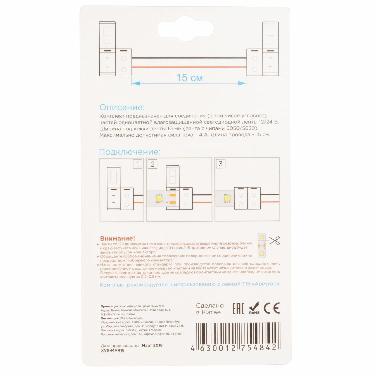 Коннектор для одноцветной светодиодной ленты 3014/5060/5050/5630 Apeyron 12/24V (2 шт. ) 09-14 в Ялте