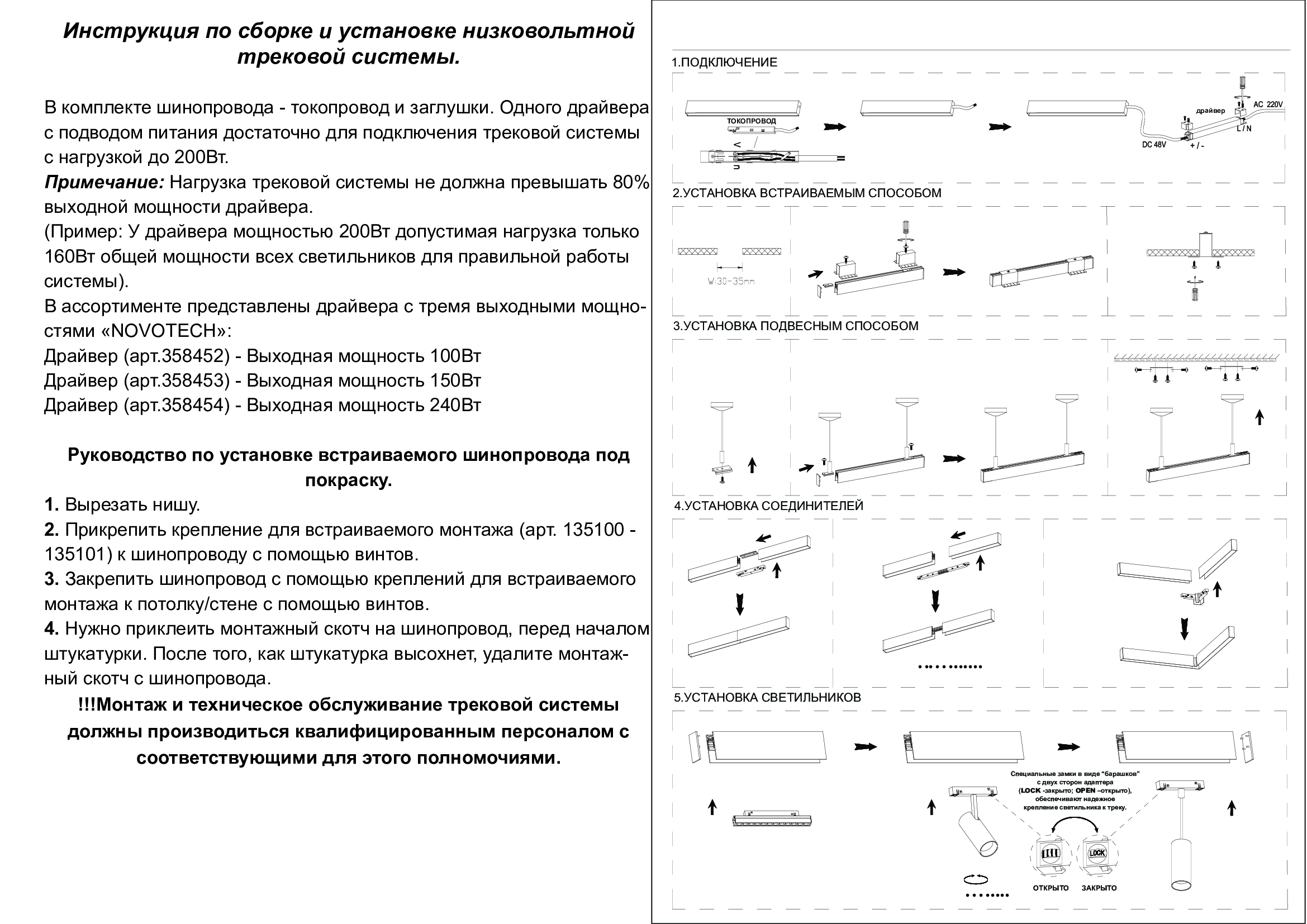 Современная компактная низковольтная трековая система 48В ™NOVOTECH предназначенная специально для интерьеров - ширина трека всего 26,2 мм. Это новое высокотехнологичное решение для искусственного освещения и декоративной подсветки. Шинопроводы просты в монтаже и удобны в эксплуатации. Это новейшая замена магнитной трековой системы. Трек можно отрезать в любом месте с точностью до миллиметра в отличие от магнитного, где длина строго зависит от размера отдельного сегмента. При этом треки легко соединяются друг с другом и их стыки не видны. Это позволяет собрать трековую систему любой длины и конфигурации. Основа шинопровода представляет собой алюминиевый профиль, который может напрямую крепиться к потолку, встраиваться в потолок с помощью специальных креплений и подвешиваться с помощью комплекта подвесов. Специальные замки в виде “барашков” обеспечивают надежное крепление светильника к треку. Светильник начинает работать, когда защелкивающееся соединение контактирует с медным слоем с обеих сторон шинопровода.