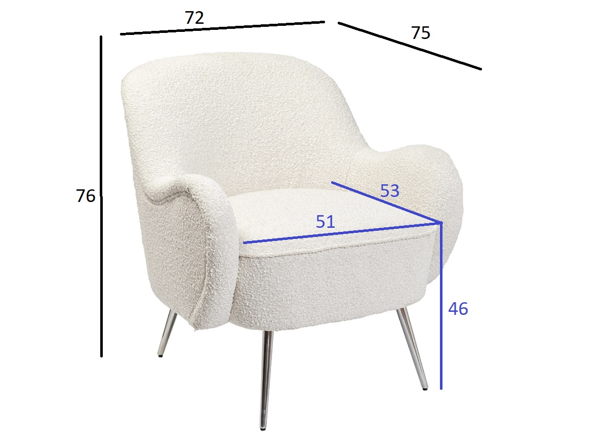 Дизайнерское кресло букле не только эффектно выглядит в интерьере, но и дарит повышенный комфорт. Благодаря мягкой округлой спинке и подлокотникам в нем очень удобно сидеть, читать книгу, отдыхать. За устойчивость отвечают металлические ножки с хромированным блеском, которые придают изящности и легкости мебели. Кресло в ткани букле будет эффектным дополнением дивану в аналогичном стиле, станет комфортным местом для отдыха в спальне, холле, в рабочем кабинете или лаунж-зоне. Обивка приятная на ощупь, устойчива к износу, легко чистится и не накапливает в себе пыль. Кремовое кресло идеально подойдет для интерьеров в стиле ар-деко, неоклассика, сканди, контемпорари. Габариты сиденья: ширина - 51см, глубина - 53см, высота сиденья - 46см. Высота подлокотников: 18/22см.