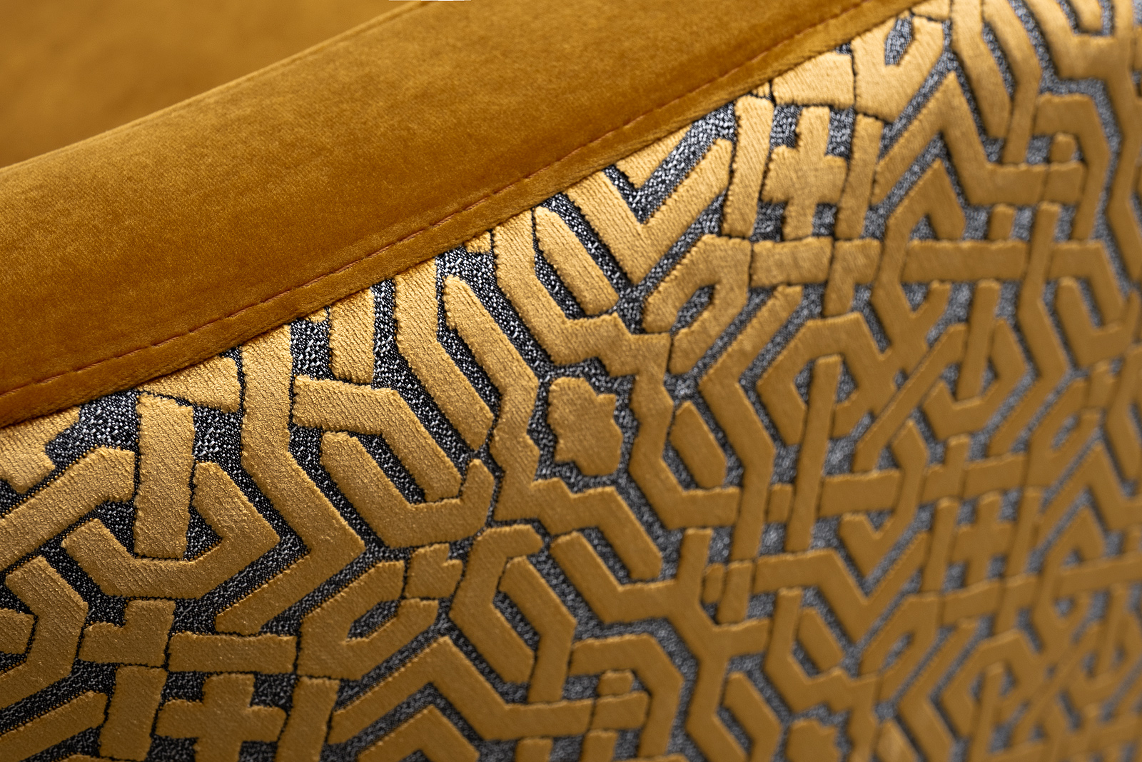 В стандартном исполнении: обивка в ткани велюр Paddington31r - внутренняя часть кресла, внешняя сторона спинки вельвет из коллекции Garda Decor- Lattice ORANG, основание - матовое золото, без декоративной подушки.