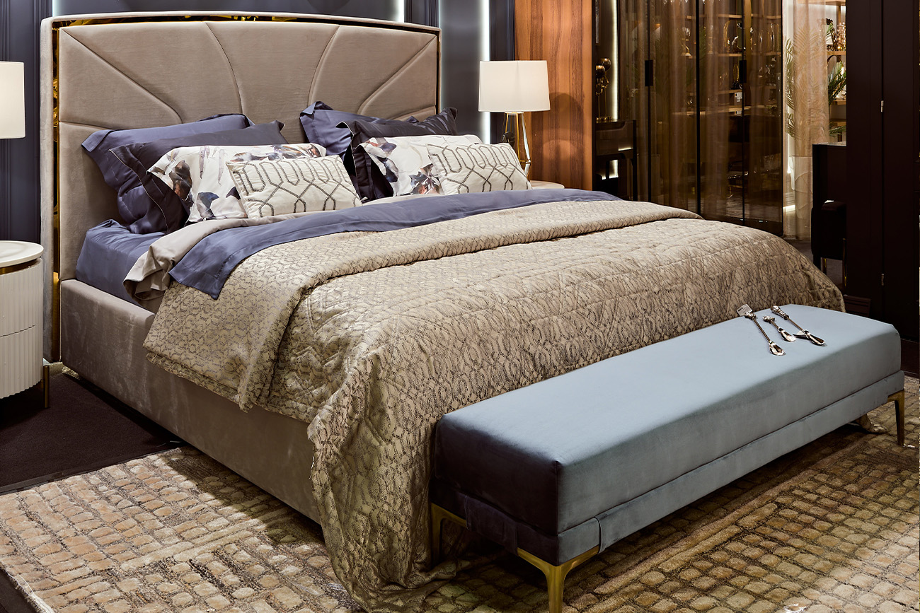 Стильная кровать с лаконичным дизайном в виде расходящихся от центра к краям лучей настраивает на спокойствие и уравновешенность. Мягкий велюр жемчужно-серого оттенка сочетается с золотистым металлическим контуром изголовья, придающим элемент законченности.