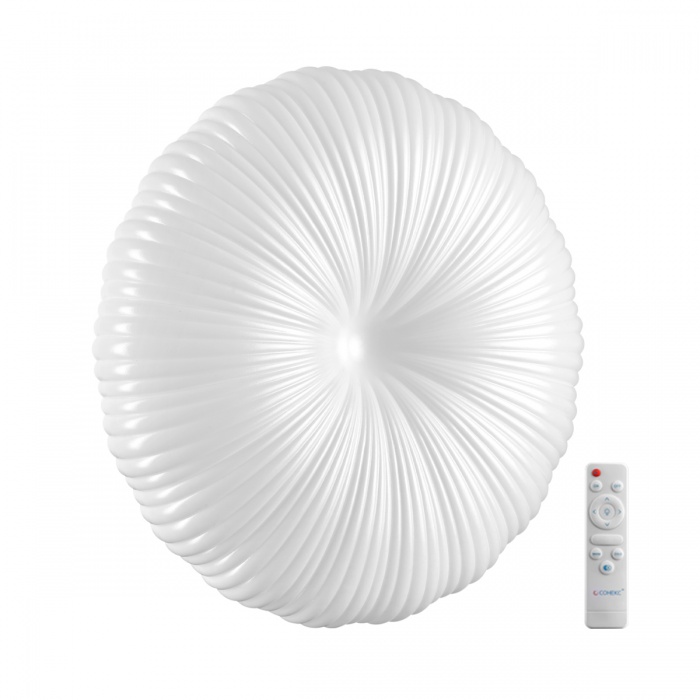 Светильник 7678/EL линии ANIX состоит из металлического основания (базы) и пластикового рассеивателя. Материал рассеивателя - высококачественный пластик марки PMMA 2.0 белого цвета с матовой поверхностью. Пластик обеспечивает светильнику равномерное рассеивание и хорошее светопропускание. Форма плафона: круглая, декорирована рельефом из пластика в виде узора белого цвета. Степень защиты IP43 позволяет использовать светильник в определенных зонах влажных помещений. В комплект входит заменяемый LED модуль с линзами, мощностью 70Вт, которая соответствует лампе накаливания 610Вт. А также пульт ДУ (с креплением на стену), с помощью которого осуществляется плавное изменение цветовой температуры 3000-6000К, изменение яркости, переход в режим переключения теплого/белого/холодного/ночного света. Светильник имеет функцию "память".