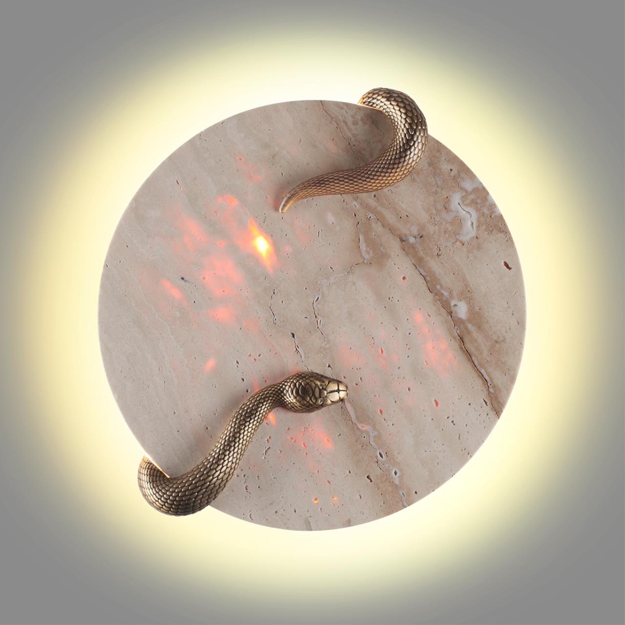 Образ мудрой змеи часто встречается в украшениях, в декоре одежды и предметах интерьера. Наш декор в светильнике SNAKE выполнен из настоящей латуни. Плафон выполнен из камня травертина, при этом за счет того, что камень в некоторых местах более тонкий, в этих местах создается необычное эффектное сияние.