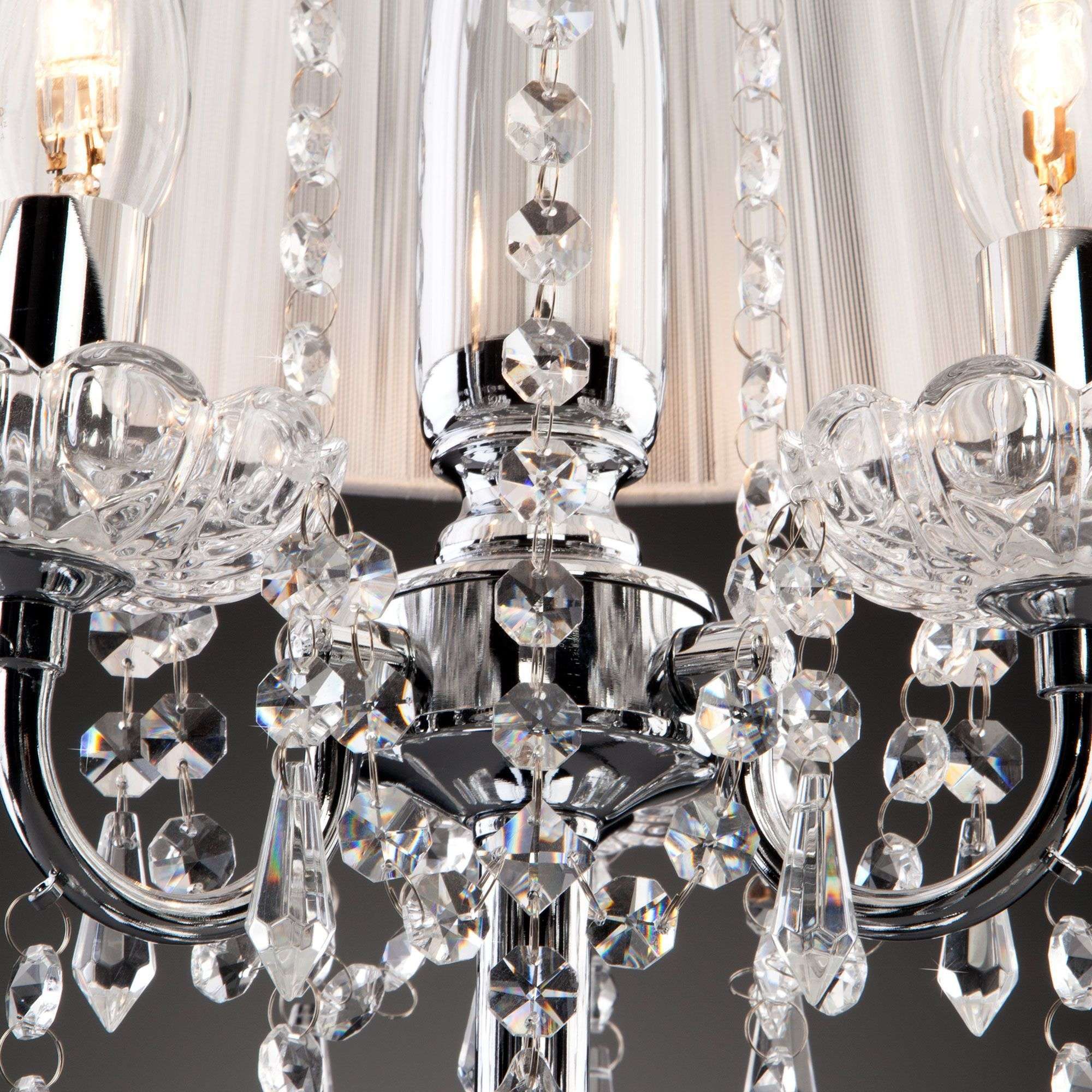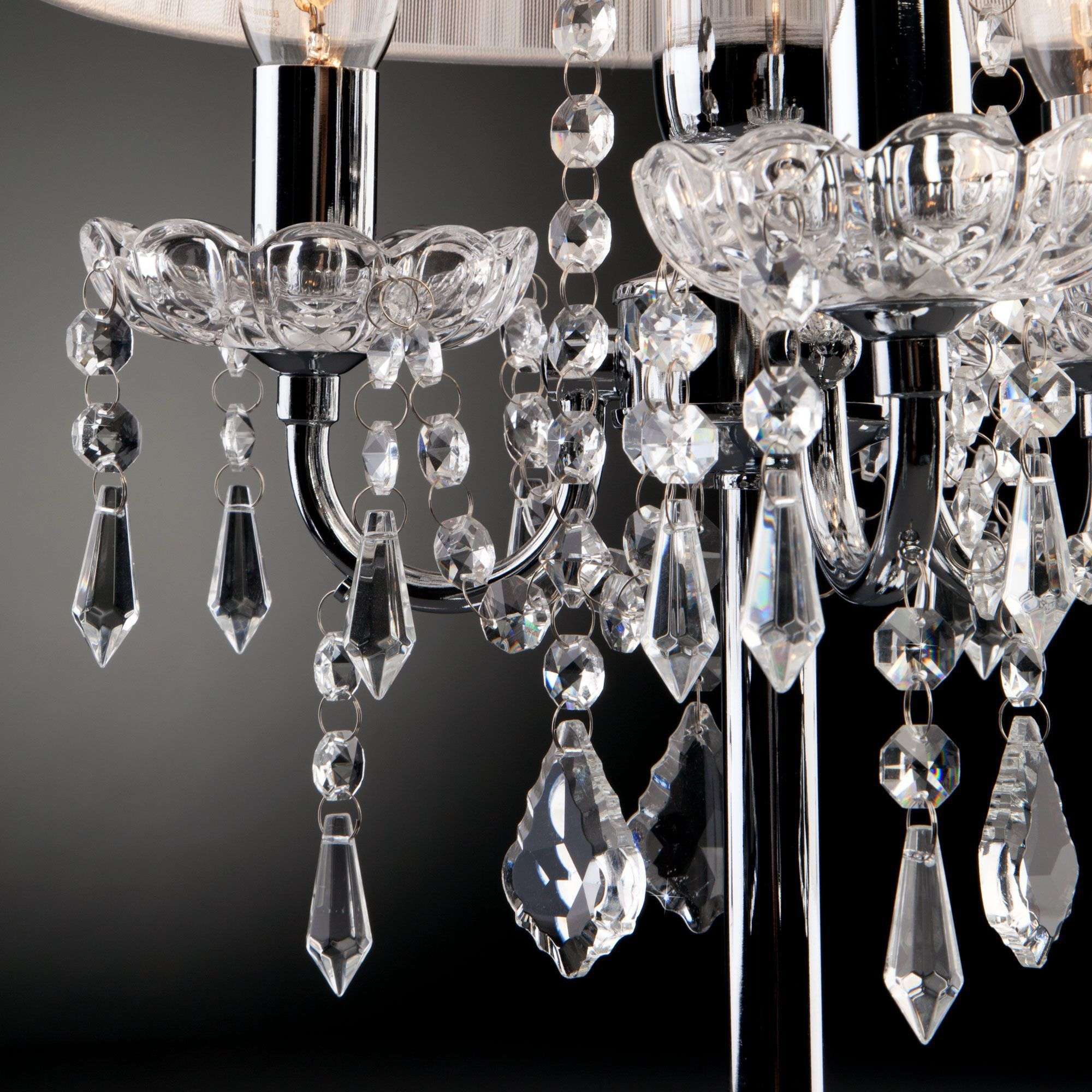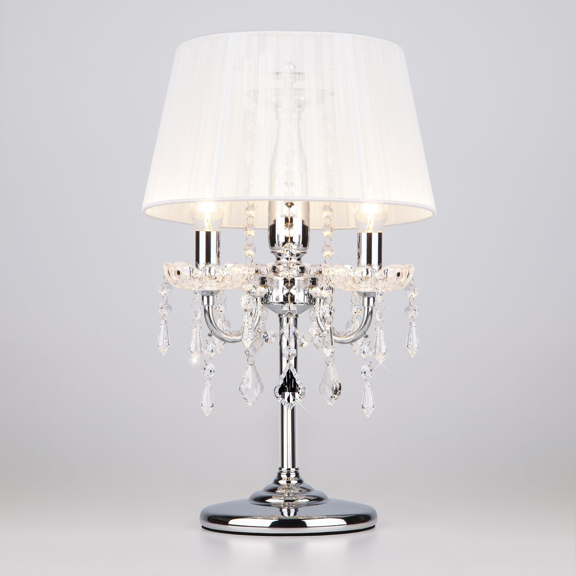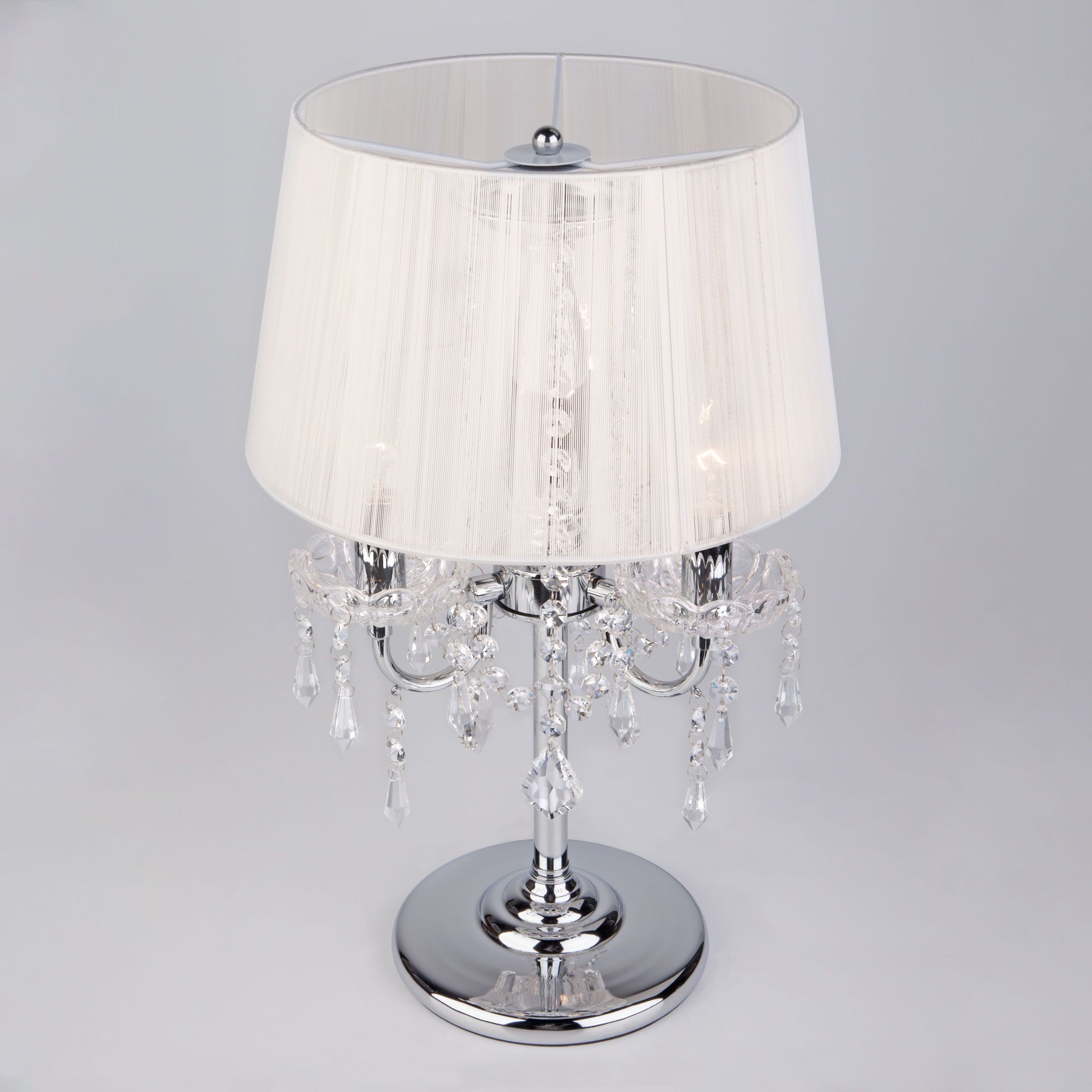 Благодаря белому тканевому абажуру настольная лампа создает мягкое рассеянное свечение, подходящее для комфортного чтения книг в вечернее время. Прочный металлический корпус светильника устойчив к механическим воздействиям, а защитное покрытие обеспечивает надежную электроизоляцию и презентабельный внешний вид. Лампа украшена декоративным хрусталем, выполненным из особого стекла с эффектной огранкой.