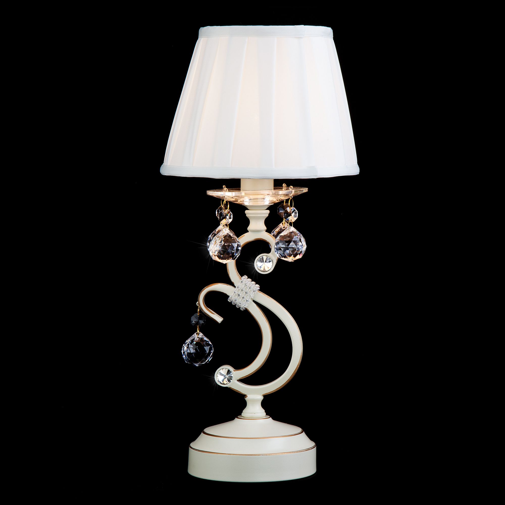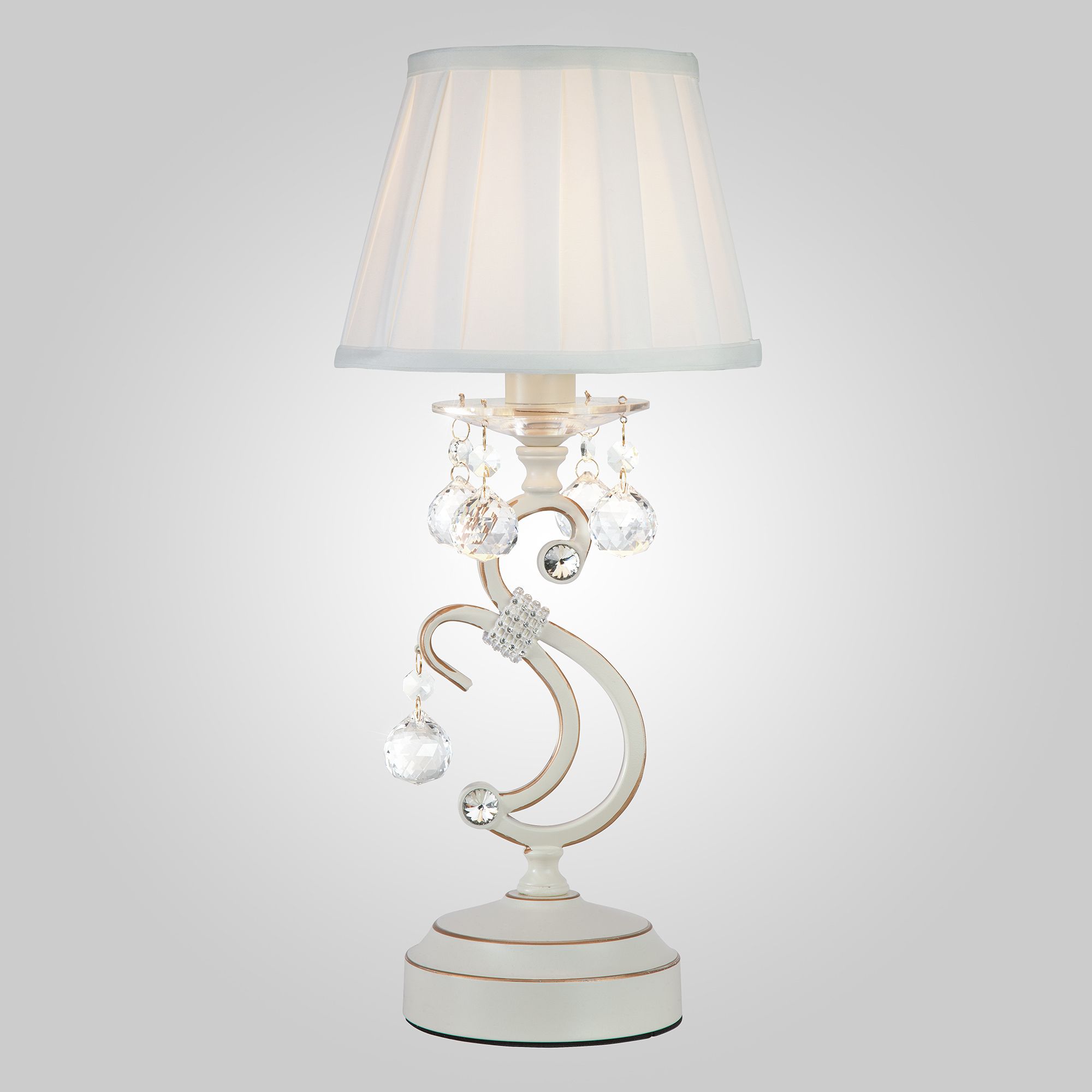 Благодаря белому тканевому абажуру настольная лампа создает мягкое рассеянное свечение, подходящее для комфортного чтения книг в вечернее время. Прочный металлический корпус светильника устойчив к механическим воздействиям, а защитное покрытие обеспечивает надежную электроизоляцию и презентабельный внешний вид. Лампа украшена декоративным хрусталем, выполненным из особого стекла с эффектной огранкой.