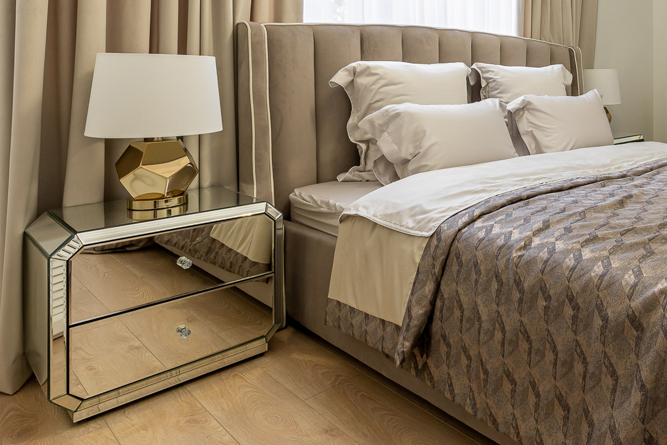 Уникальный вариант осветительного прибора с белым абажуром на ножке оригинальной формы. Расположенная в спальне, на прикроватной тумбочке, такая настольная лампа станет идеальным вариантом для чтения, рукоделия или просто для того, чтобы спокойно заснуть тому, кто не любит делать этого в темноте. За счет кристаллообразной ножки внешне лампа напоминает некий арт-объект. Дизайн золотой настольной лампы позволяет выполнять ей не только функциональную роль, но и привлекать к себе внимание