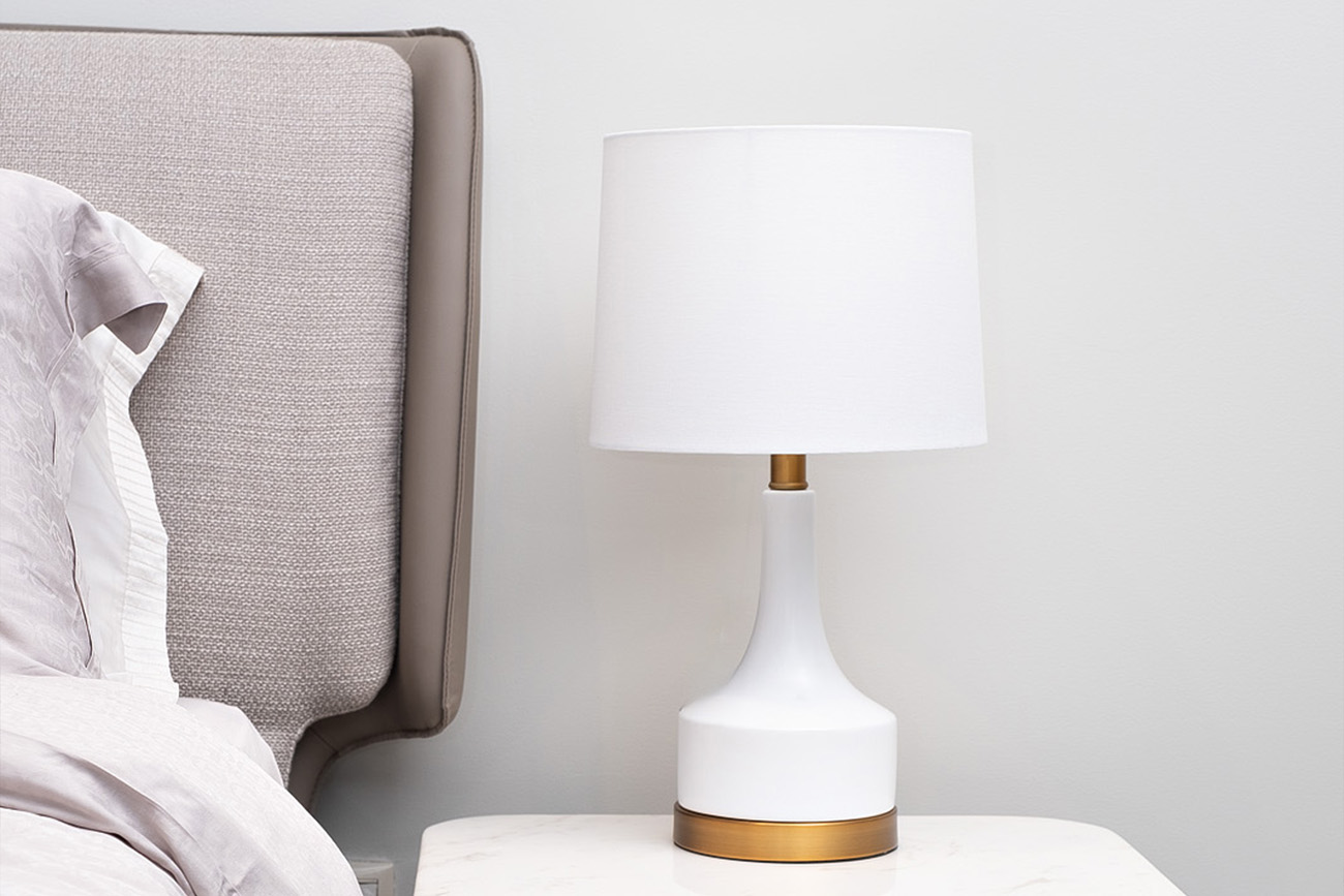 Простая, красивая и элегантная настольная лампа украсит прикроватный столик или письменный стол. Устойчивое керамическое основание белого цвета отделано золотистым металлическим ободком. Молочно-белый льняной плафон мягко рассеивает свет. Все линии пропорциональны и сдержаны, позволяют вписать лампу практически в любой интерьер.