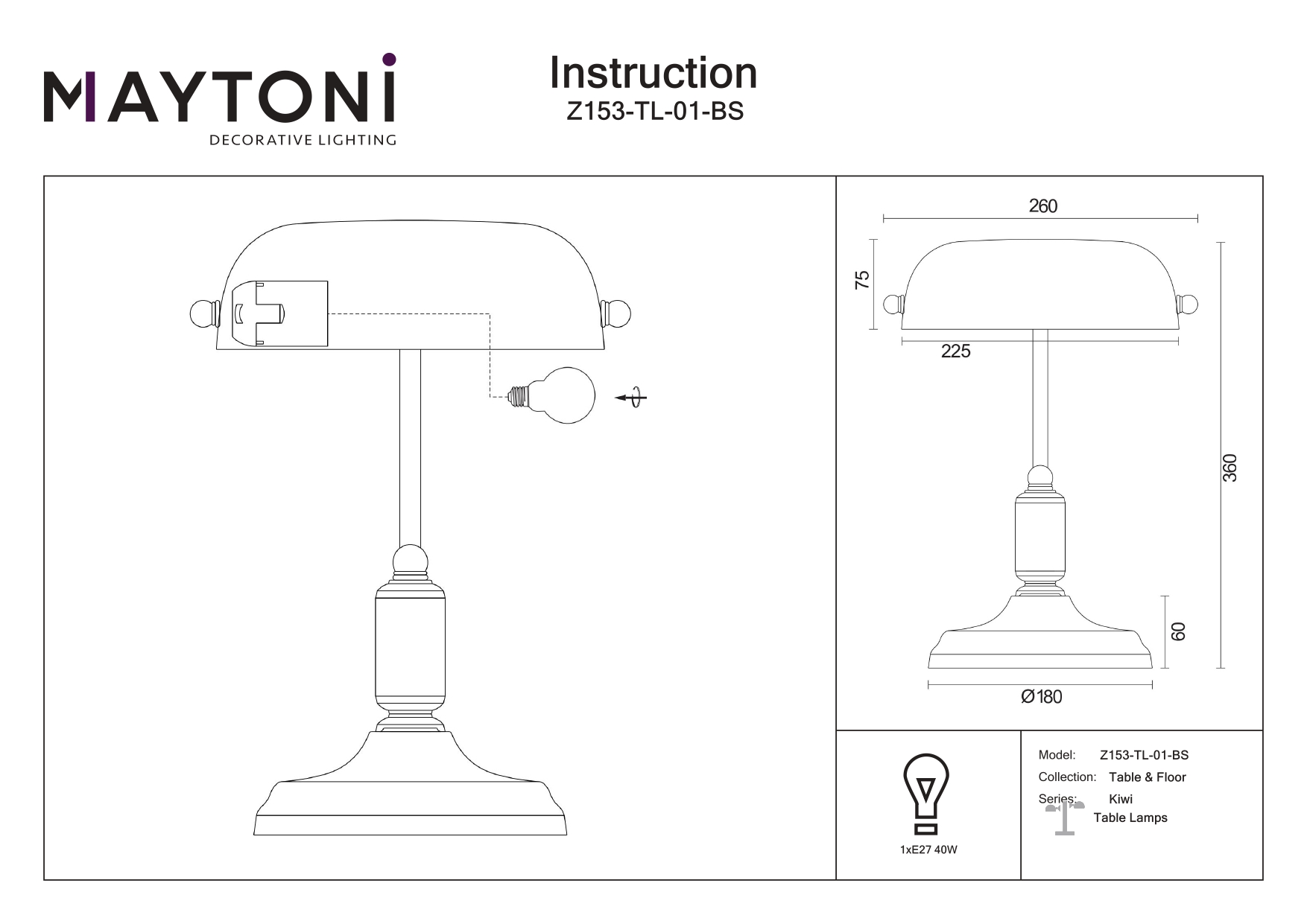 Модель Kiwi Z153-TL-01-BS Немецкого бренда Maytoni из коллекции Kiwi выполнена в стиле Ретро и хорошо подойдет для офиса площадью освещения до 2,2 м2. Настольная лампа имеет 1 овальный плафон из стекла зеленого цвета и 1 лампу. Производитель рекомендует использовать лампы накаливания c цоколем E27 до 40 W или светодиодные лампы до 8 W! Основание Kiwi Z153-TL-01-BS сделано из металла бронзового цвета. Офисные