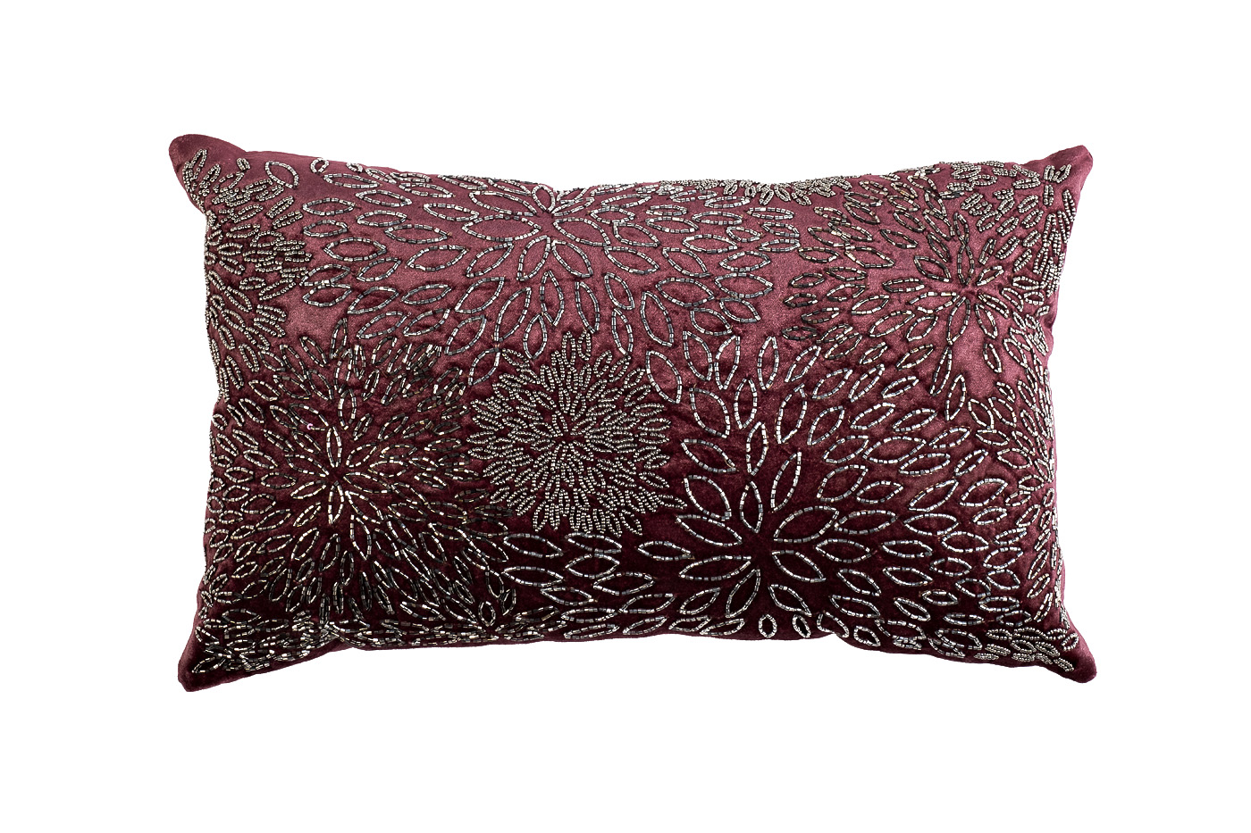 С подушками легко и просто разнообразить привычный интерьер. Ваша мягкая мебель «заиграет по-новому» благодаря декоративной подушке с вышивкой. Такая изюминка обогатит пространство как модный аксессуар. Бордовый цвет в сочетании с серебристым принтом привнесет в интерьер нотки загадочности, роскоши, лоска. Бордовая декоративная подушка из вискозы и хлопка выполнена из экологически чистых, гипоаллергенных материалов. Классическая прямоугольная форма – для ценителей комфорта и лаконичности.