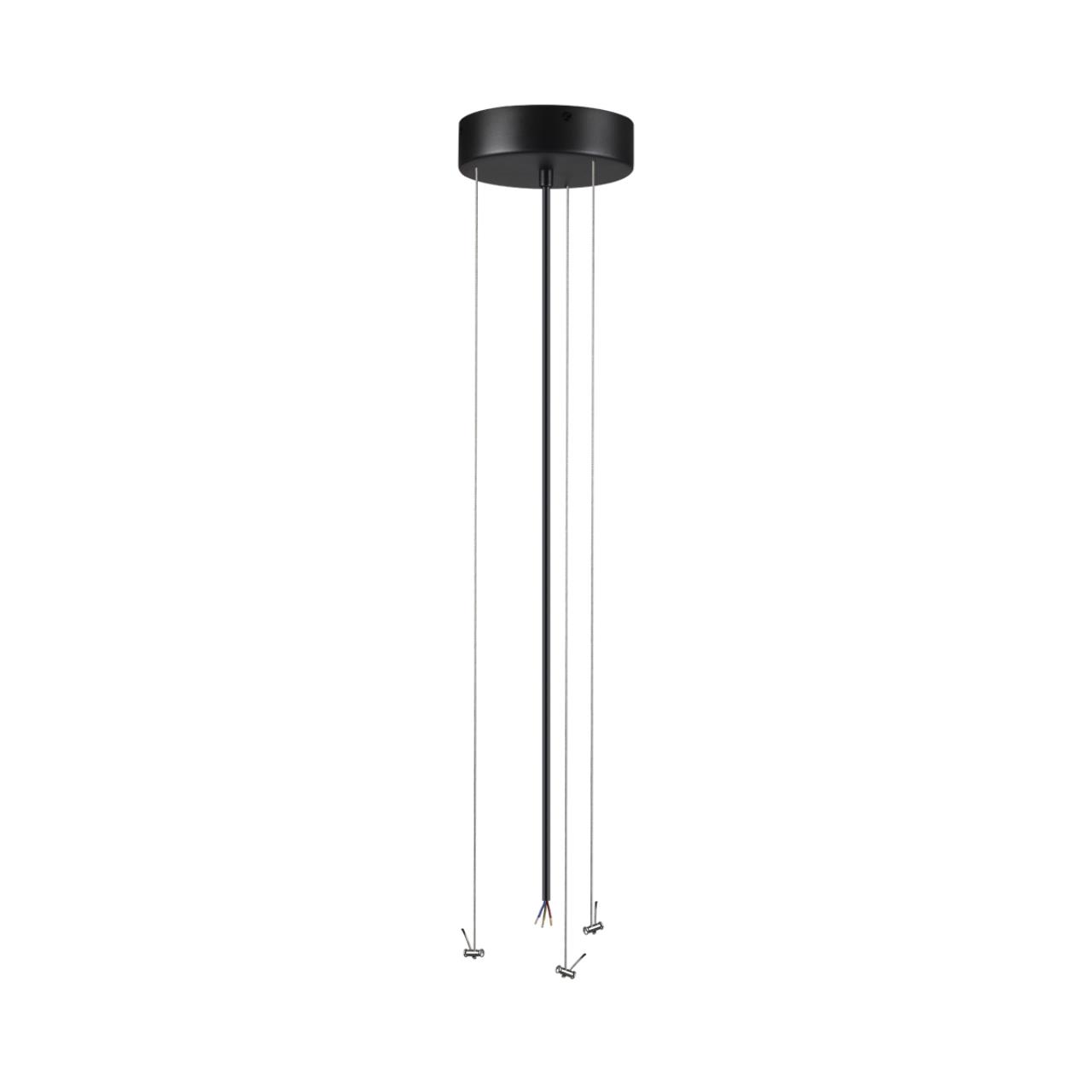 Тросы подвесного крепление для модели QUASAR LED выполнены из металла в приятной на ощупь силиконовой оплетке. Питающий провод и потолочная чаша выполнены в цвете внешнего контура корпуса светильника - угольно-черном.