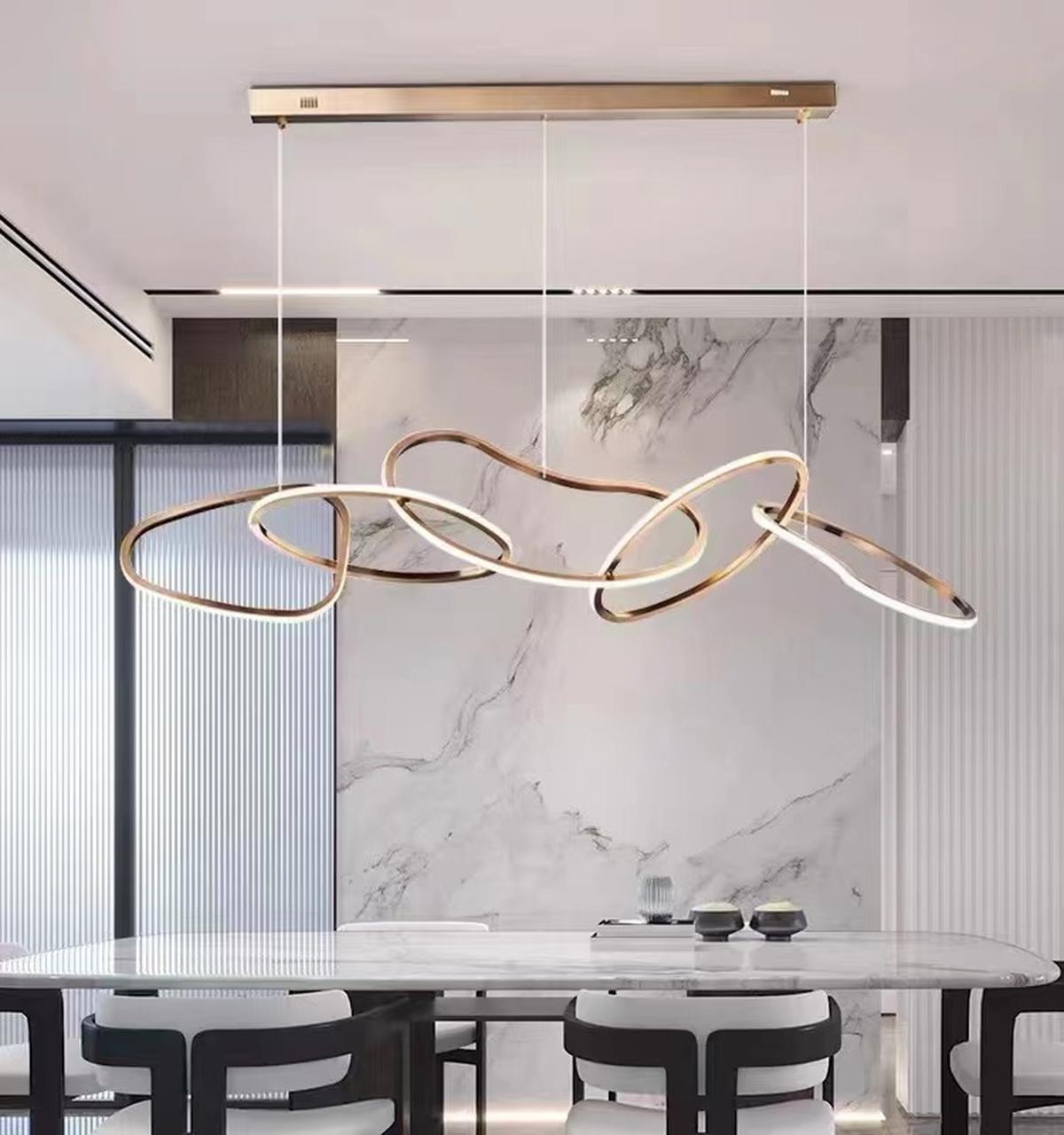 Модель состоит из 5 колец необычной формы, оснащенных светодиодной лентой. Эта люстра не только энергоэффективна, но и обеспечивает равномерное освещение площади от 15 до 20 квадратных метров. Высота люстры 1500 мм длина 1200 мм позволяют создать уютную атмосферу в любом помещении.