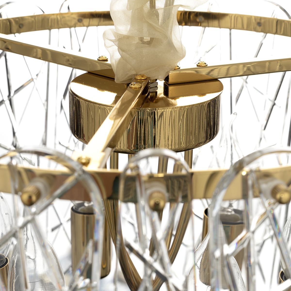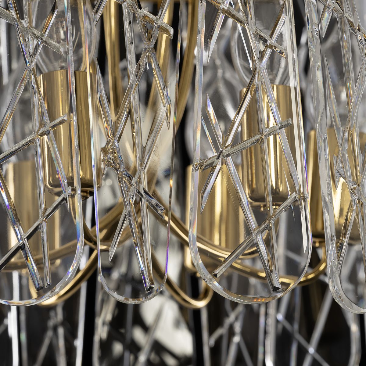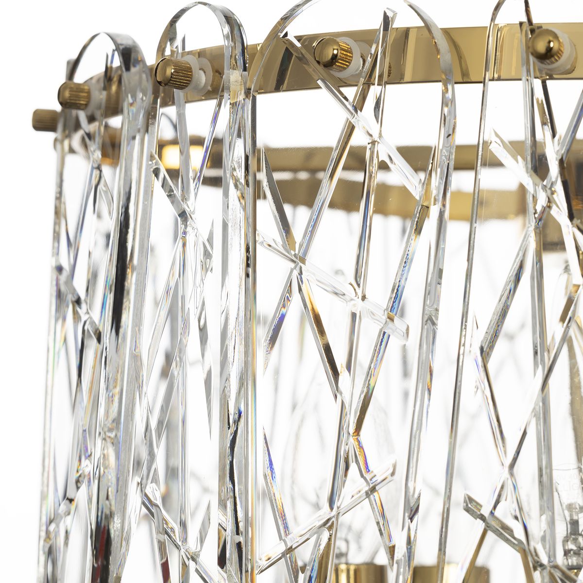 Каркас светильника из металла благородного золотого оттенка. Тонкие хрустальные пластины с замысловатым декоративным рисунком превращают свет в магию: мягкие лучи, проходя через хрусталь, рассыпаются по комнате миллионами радужных бликов.