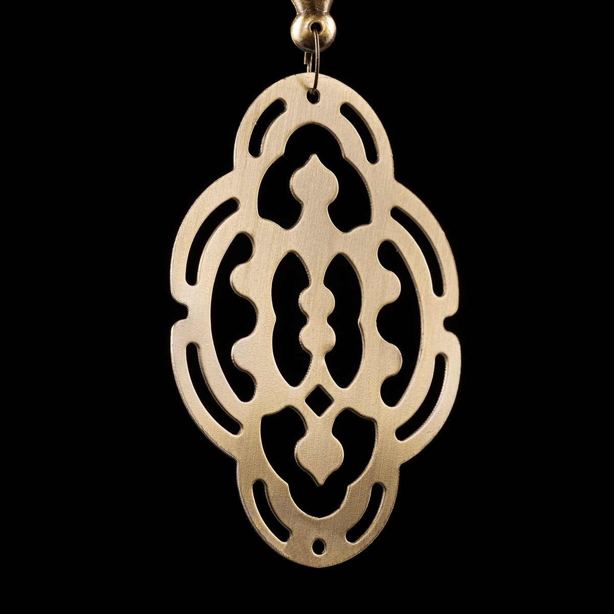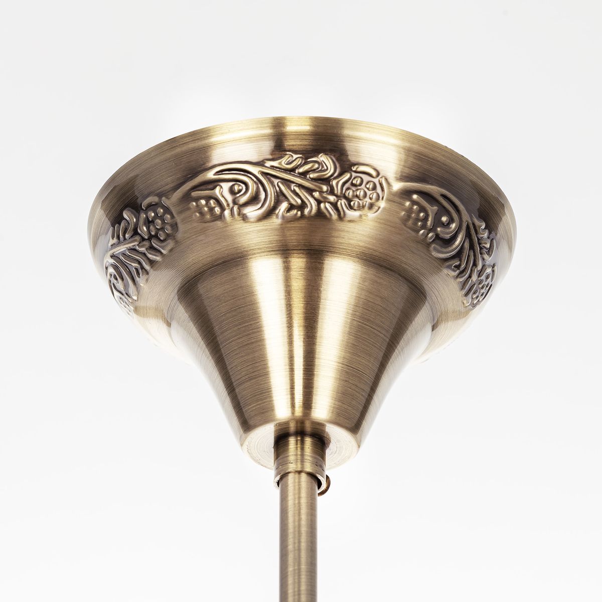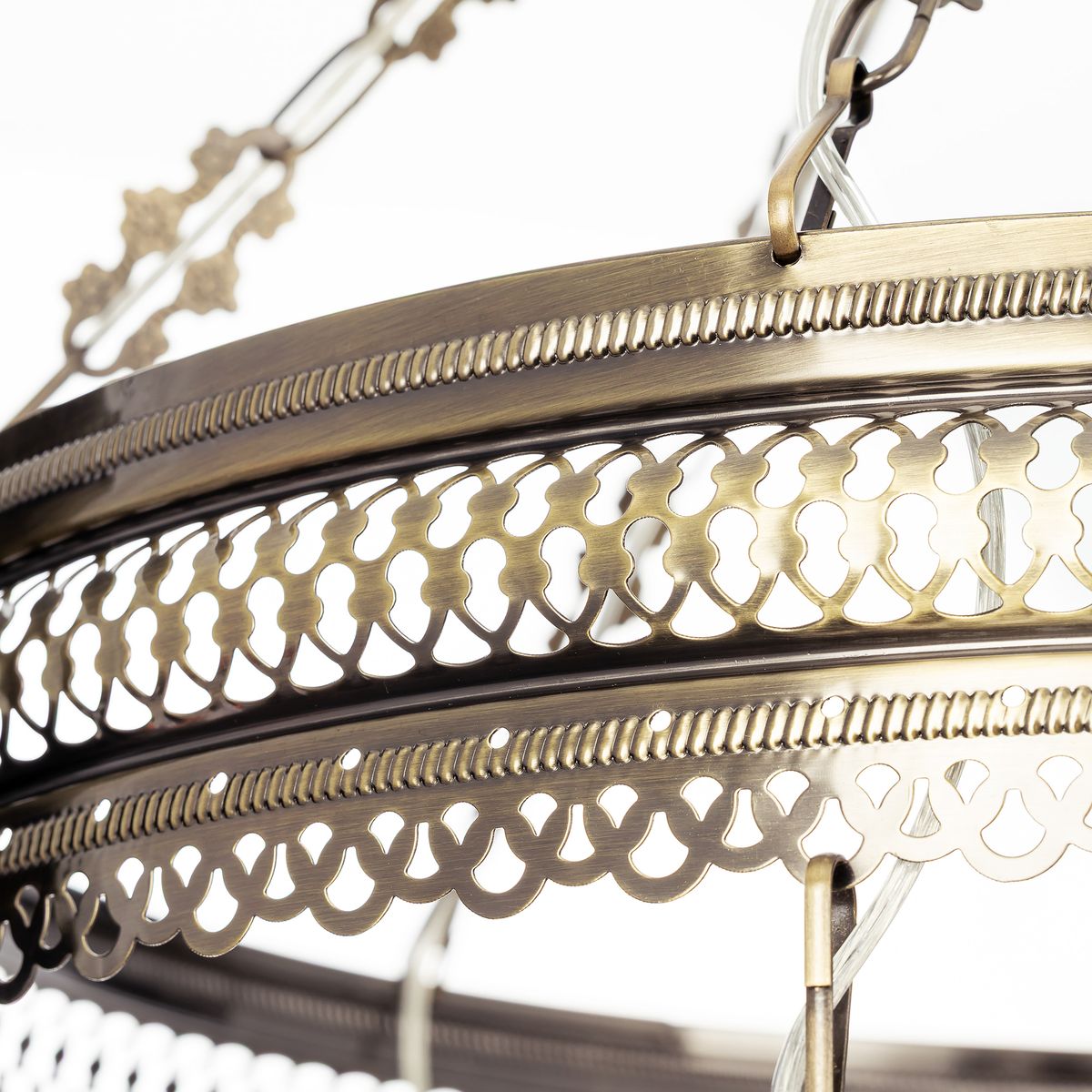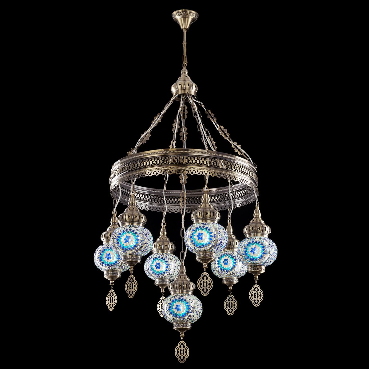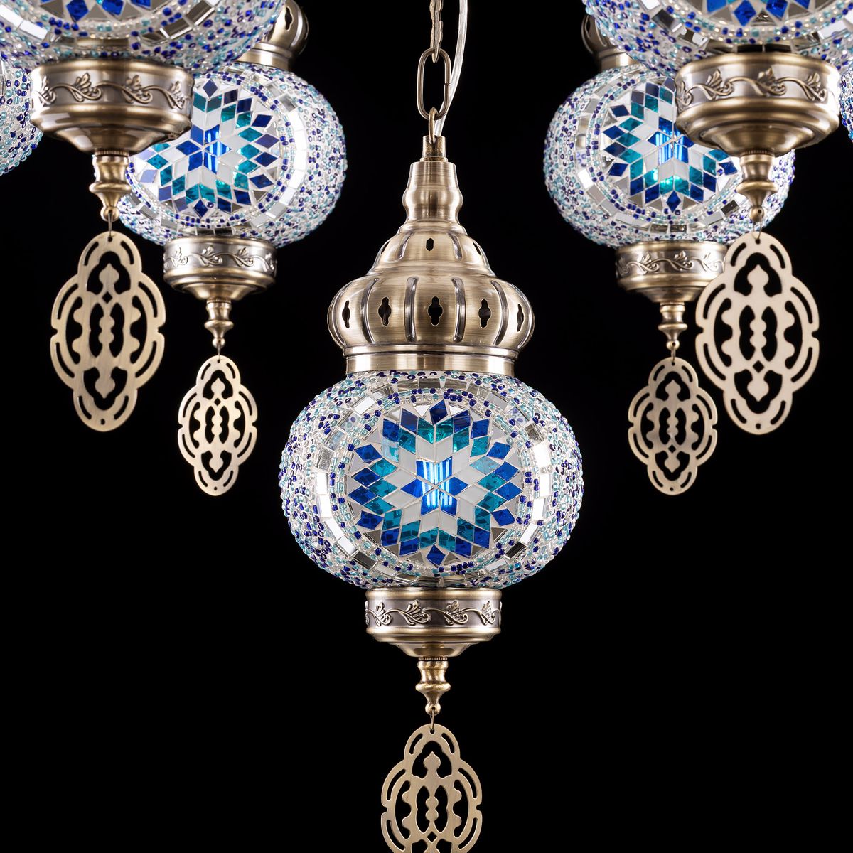 Семь подвесных плафонов, выполненных в форме слегка приплюснутых шаров, украшены мозаикой в сине-голубых оттенках. Это наполняет пространство чувством свежести и гармонии. Металлический каркас благородного бронзового цвета декорирован искусной чеканкой.