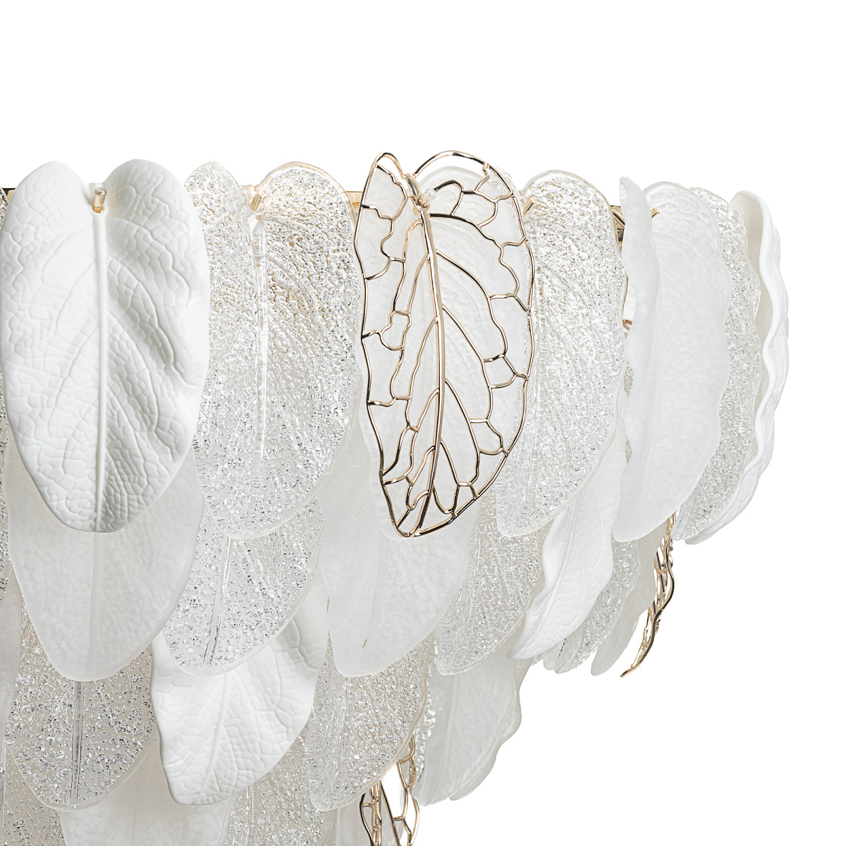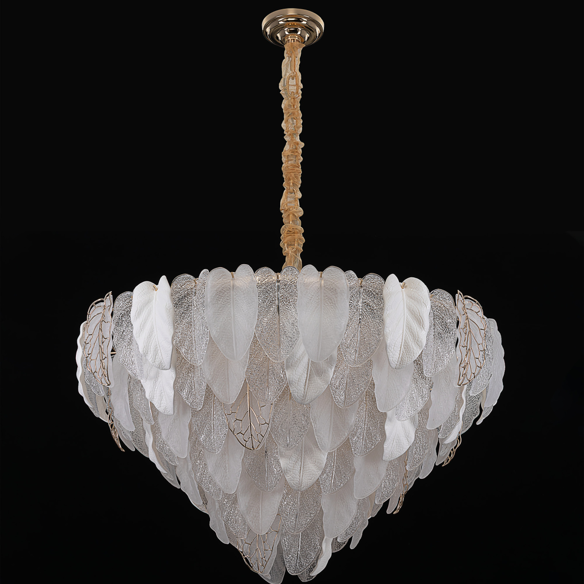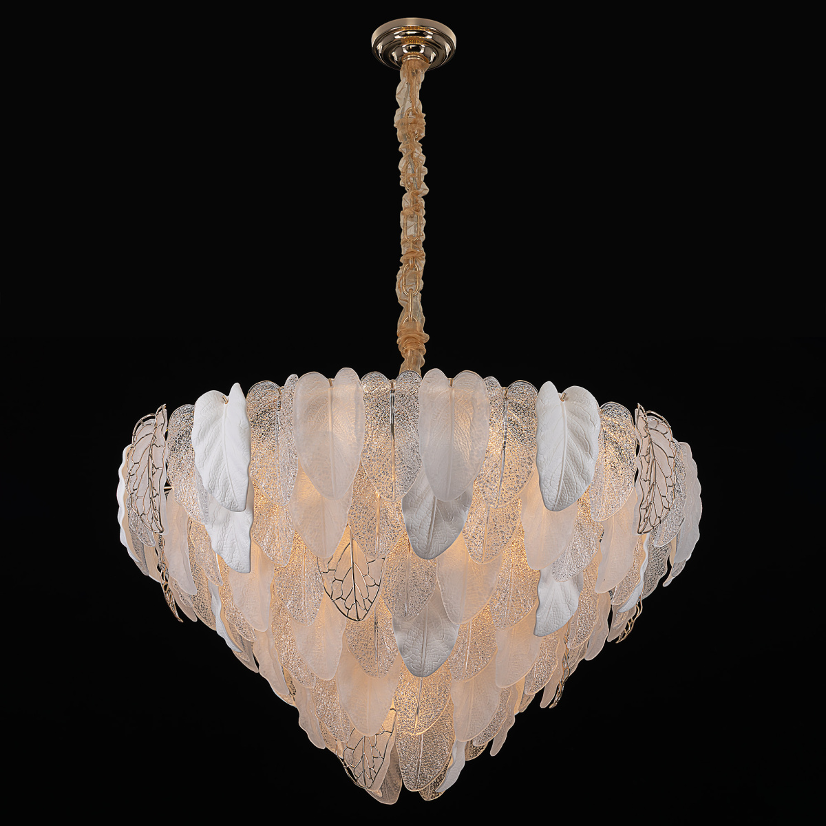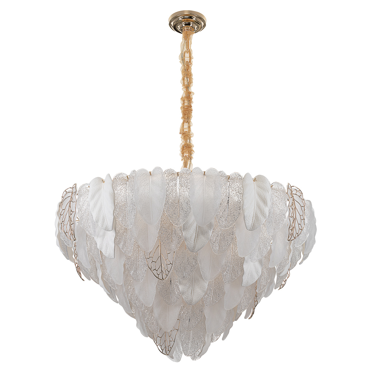 Металлический каркас золотистого оттенка переливается в лучах света. Листья из полуматового и прозрачного рифленого стекла, белой керамики, а также металлические листья с прожилками, отлитые по ювелирной технологии, подчеркивают флористическую изысканность и четкость силуэта люстры. В изделии используются 29 лампочек с цоколем Е14, высоту подвесной цепи можно отрегулировать.
