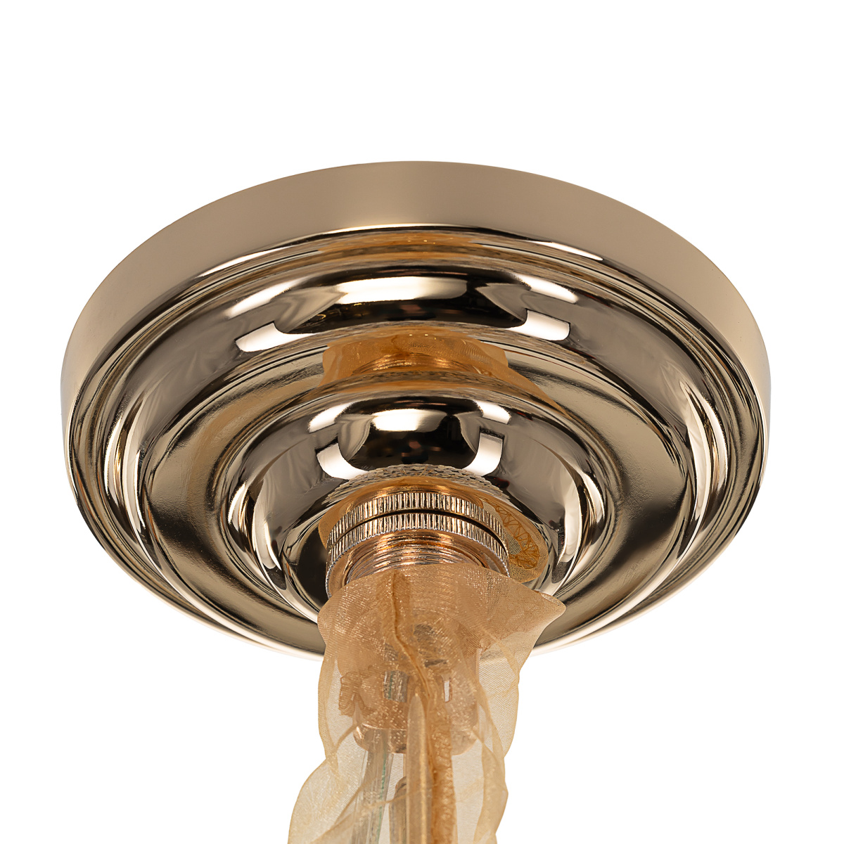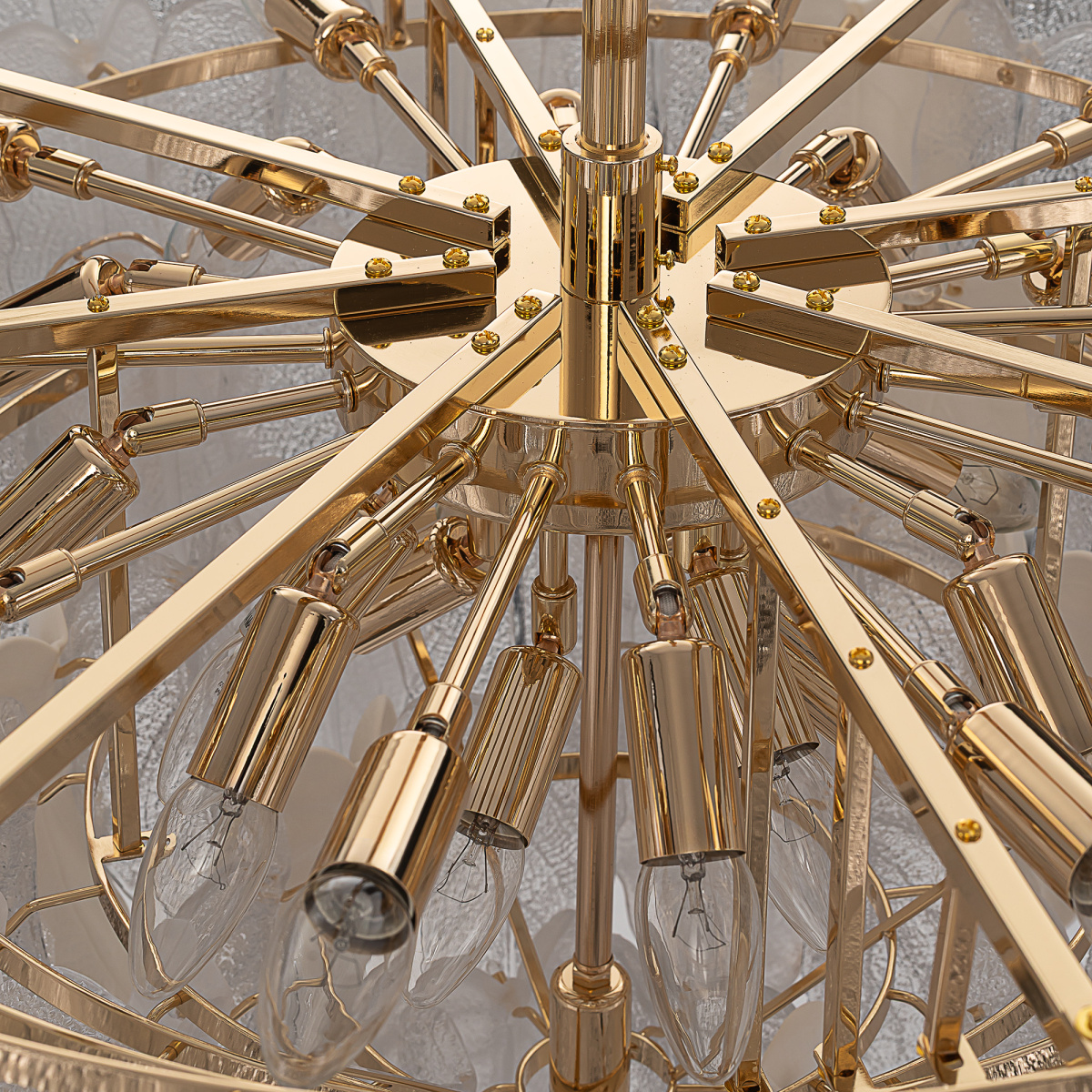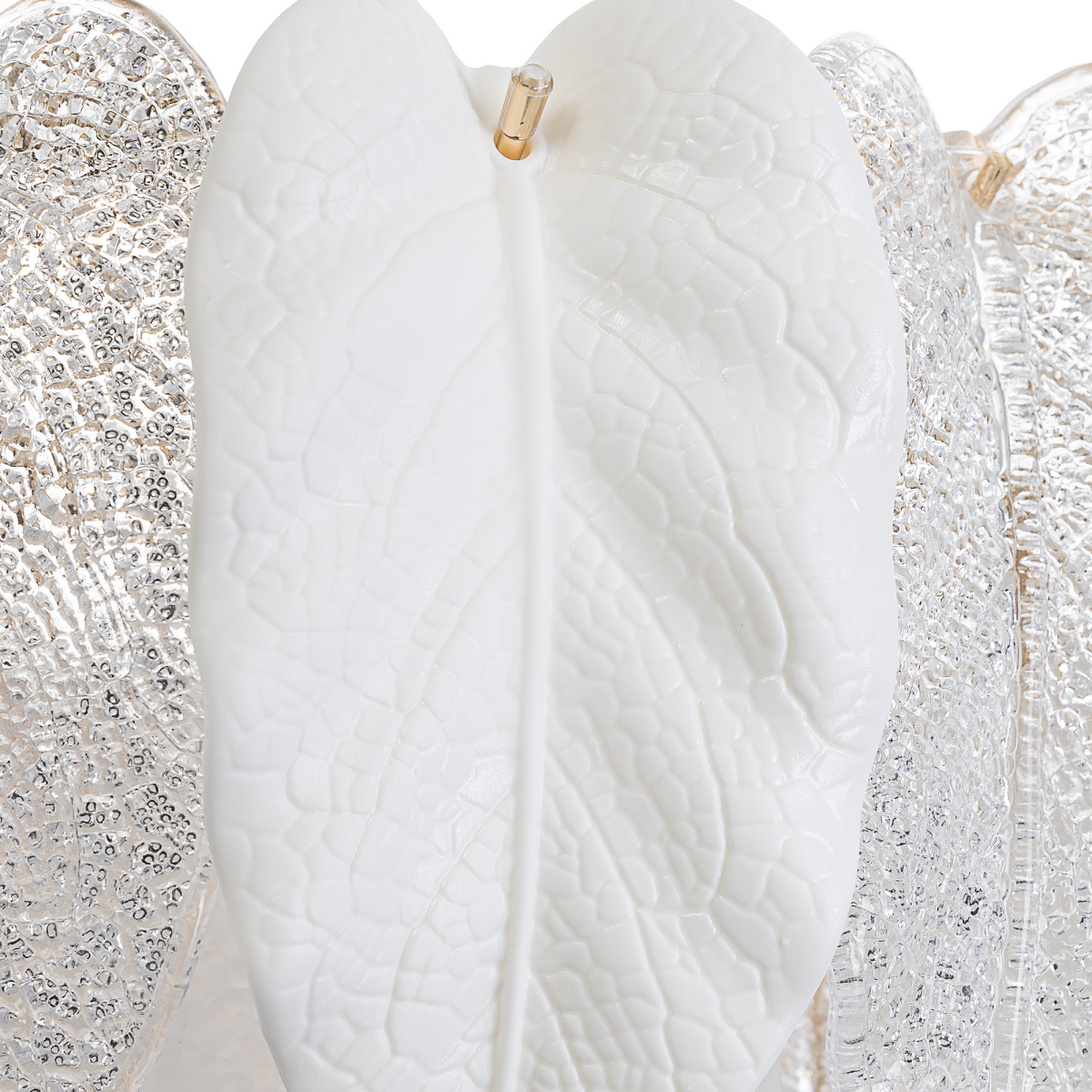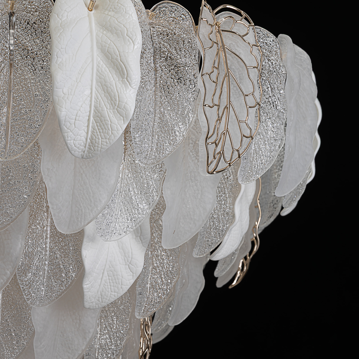 Металлический каркас золотистого оттенка переливается в лучах света. Листья из полуматового и прозрачного рифленого стекла, белой керамики, а также металлические листья с прожилками, отлитые по ювелирной технологии, подчеркивают флористическую изысканность и четкость силуэта люстры. В изделии используются 29 лампочек с цоколем Е14, высоту подвесной цепи можно отрегулировать.