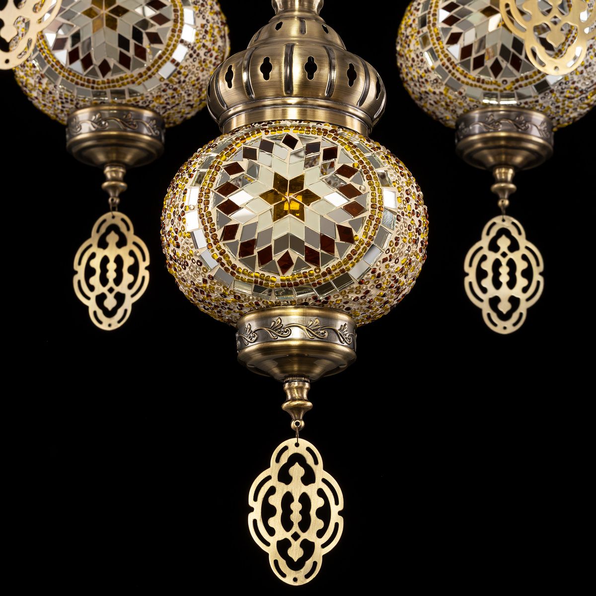 Семь подвесных плафонов, выполненных в форме слегка приплюснутых шаров, словно капли меда, застывшие в воздухе. Стеклянная мозаика в оттенках янтаря наполняет пространство теплым, уютным свечением. Металлический каркас благородного бронзового цвета декорирован искусной чеканкой.
