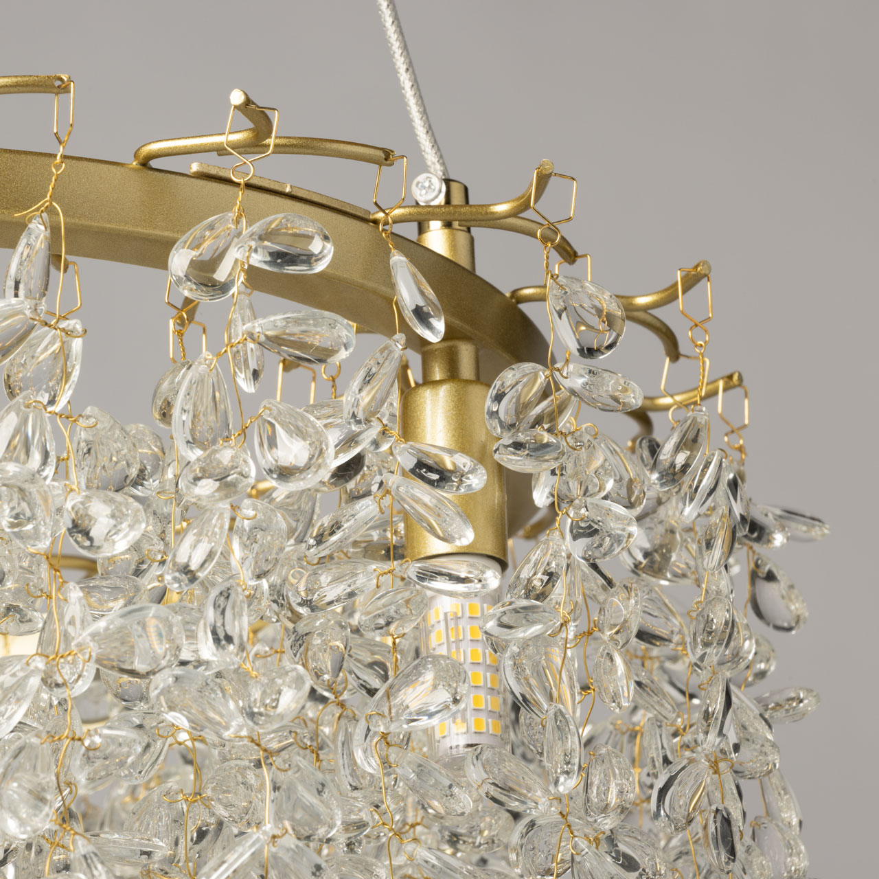 Металлическое основание подвесной люстры окрашено в цвет латуни. Люстра декорирована подвесками из прозрачного декоративного стекла.