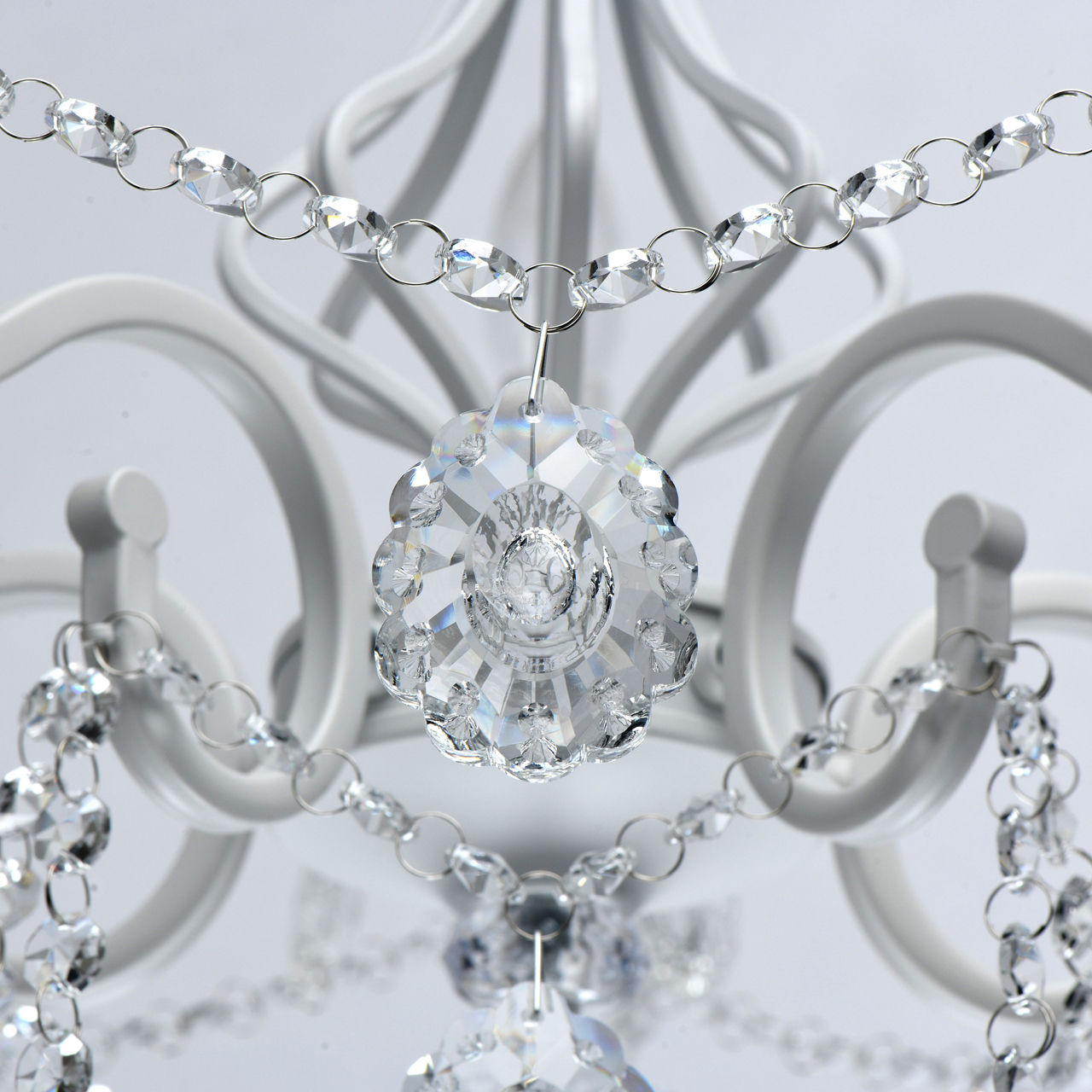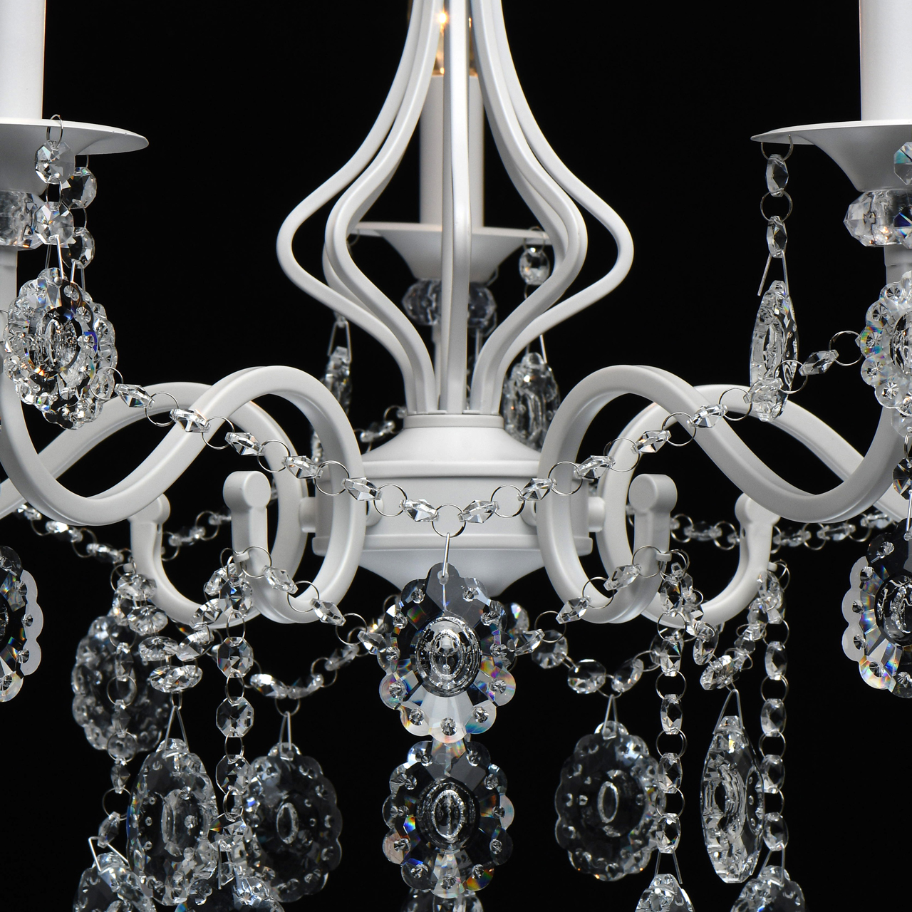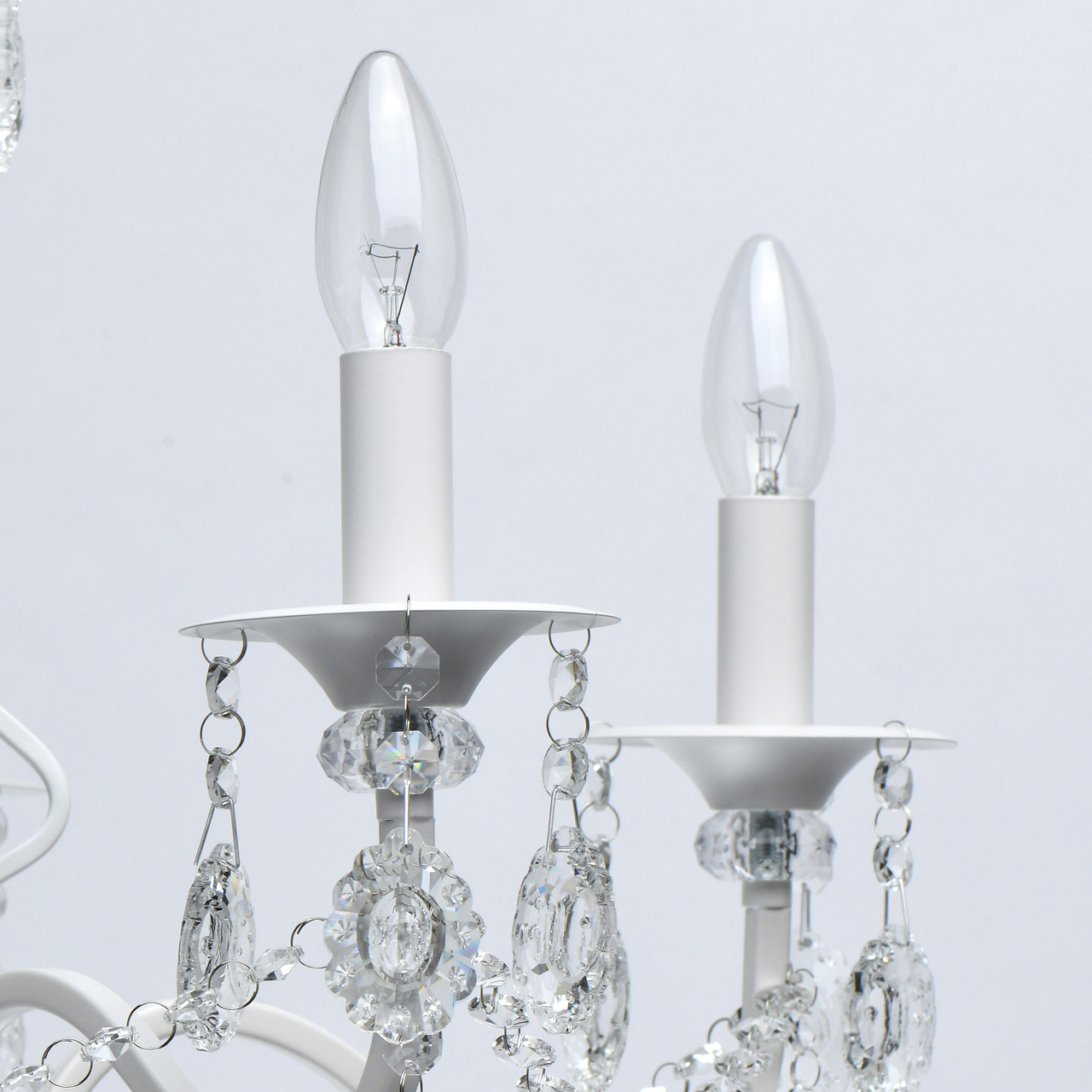 Классическая форма рожков-свечей с основанием белого цвета художественной формы.Хрустальные подвески оригинальной формы, цепочки из прозрачных хрустальных октагонов обеспечивают игру света.Массив хрусталя украшает розетки и создает дополнительный акцент.