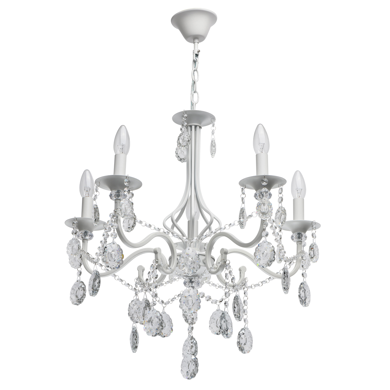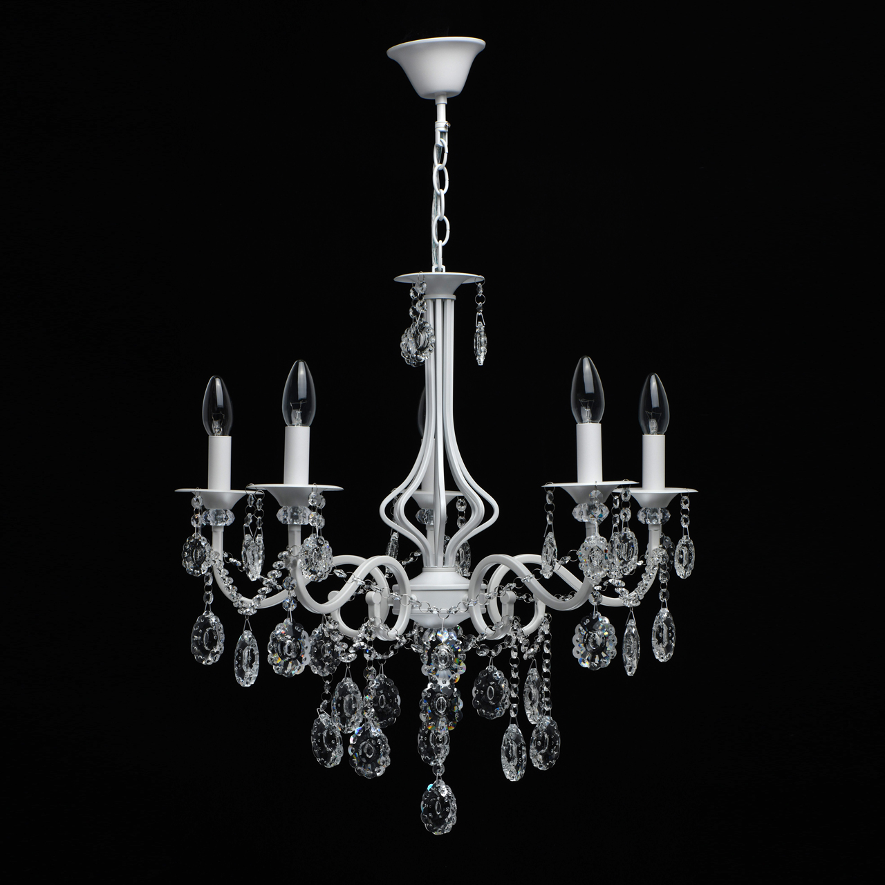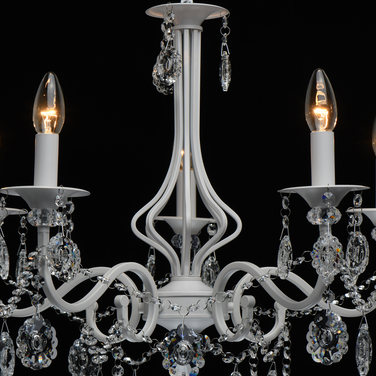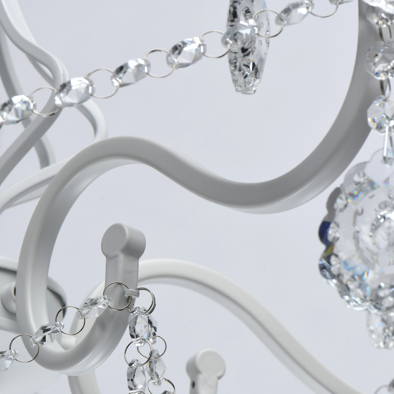 Классическая форма рожков-свечей с основанием белого цвета художественной формы.Хрустальные подвески оригинальной формы, цепочки из прозрачных хрустальных октагонов обеспечивают игру света.Массив хрусталя украшает розетки и создает дополнительный акцент.