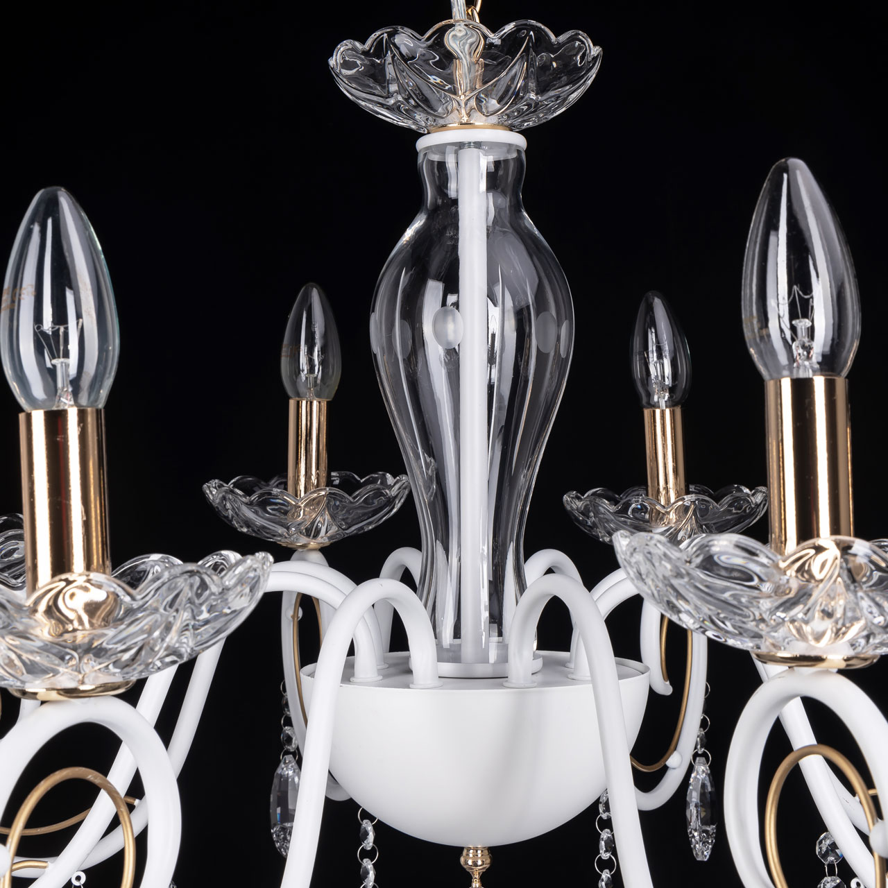 Уникальная композиция практически целиком выполнена из стекла ручной работы. Центральная часть украшена ажурными розетками и «подсвечниками». Металлические детали гальванизированы в чистый белый цвет, а некоторые элементы – в золото. Такое благородное сочетание достойно дополнит интерьер гостиной или спальни в стиле классика или ампир, а открытые лампы, имитирующие пламя свечи, обеспечат высокие параметры освещенности.