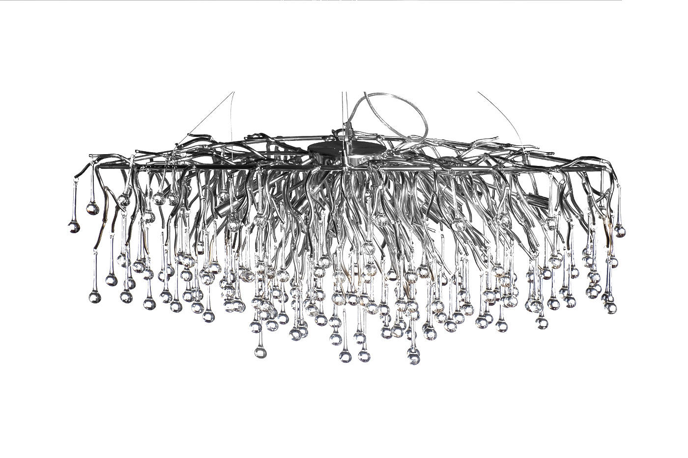 Роскошная подвесная люстра в цвете хром выполнена в виде имитации капель из стекла, ниспадающих с тонких металлических веток. Композиция выполнена с размахом в 120 см шириной. Такая подвесная люстра призвана увенчивать высокие потолки гостиной, зоны над большим обеденным столом или просторных холлов. Масштабность исполнения не лишает изделие изысканности – тончайшая работа над каждой деталью делают подвесную люстру произведением современного интерьерного искусства. Рекомендуемая площадь освещения 26-35 м2.