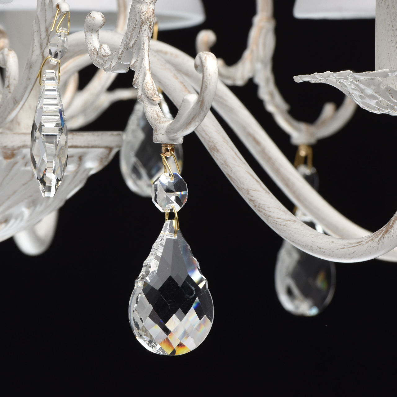 Основание из металлического сплава окрашено в белый матовый тон с эффектом золотой патины, которая создает иллюзию благородной состаренности. От основания спускается подвес в виде цепи длиной 28 см. Декоративная розетка и изящно изогнутые рожки увенчаны тканевыми плафонами с сатиновой текстурой. Особенность модели – в резных элементах и хрустальных каплях, которые украшают люстру и создают световые переливы.