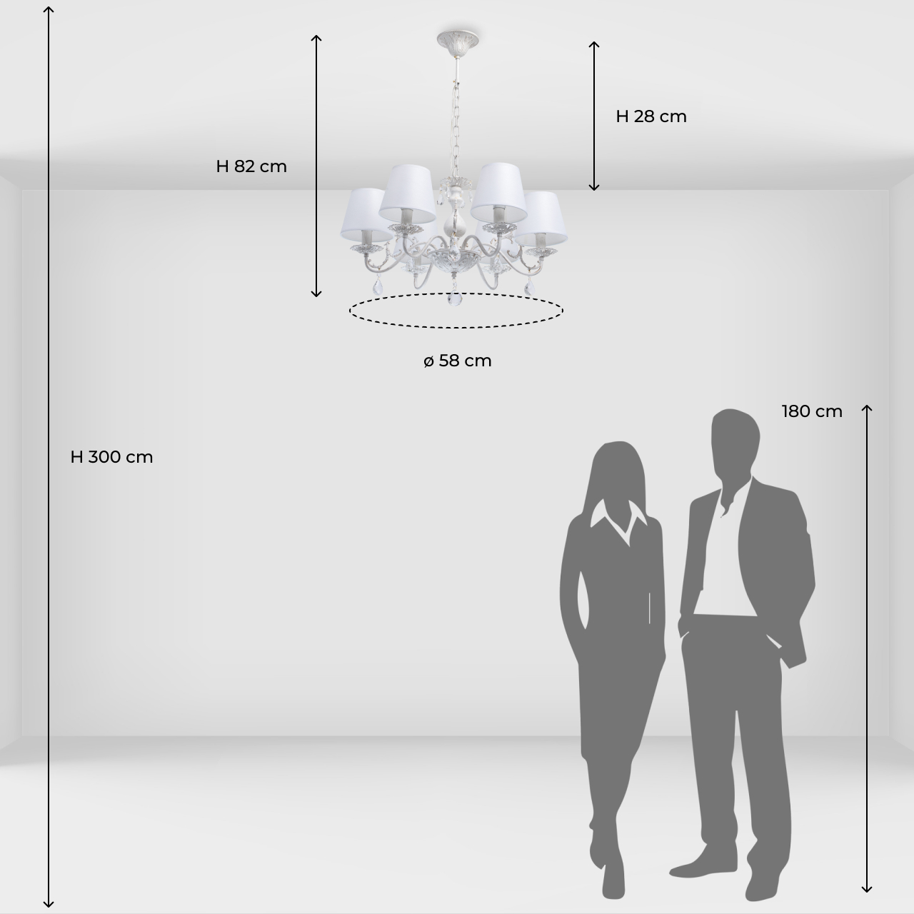 с учетом подвеса длиной 28 см, подходит для стандартных и высоких потолков;