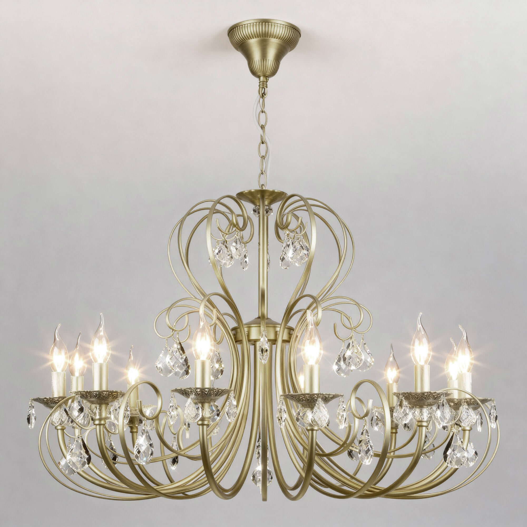 Светильник, вдохновлённый дворцовыми интерьерами: латунная арматура с утончёнными вензелями хранит память о вековых традициях мастерства, а бесцветный хрусталь преломляет свет, создавая эффект сияющих звёзд.