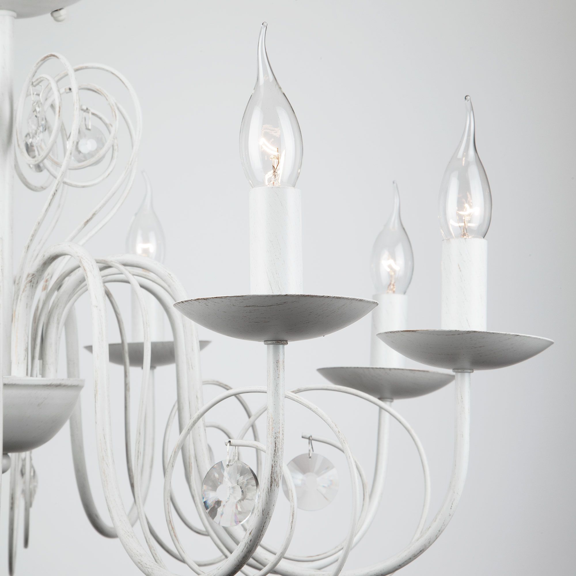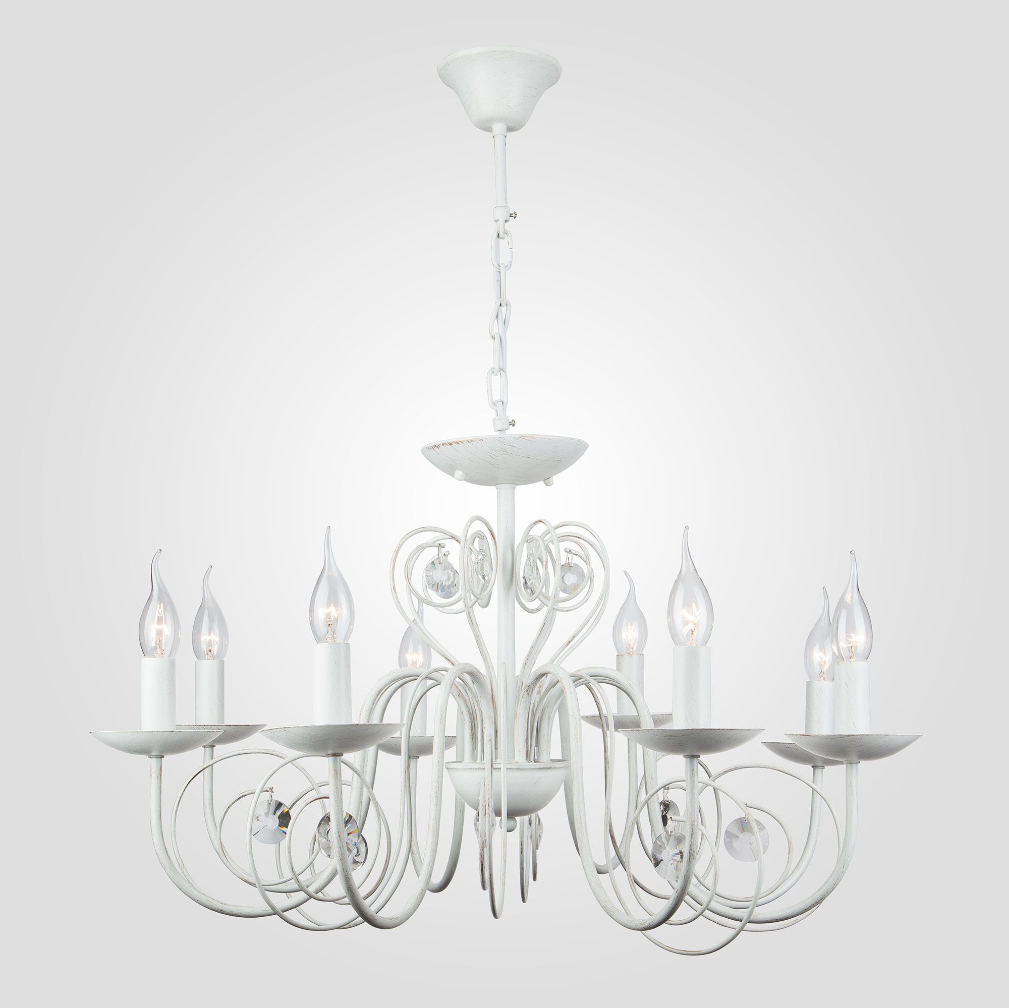 Классическая люстра с хрусталем на 8 рожков в цвете белый с золотом преобразит потолочное пространство и создаст в вашем помещении комфортное полноценное освещение на площади 38 м кв. Изящные формы и классический стиль добавят вашей гостиной утонченного аристократизма.