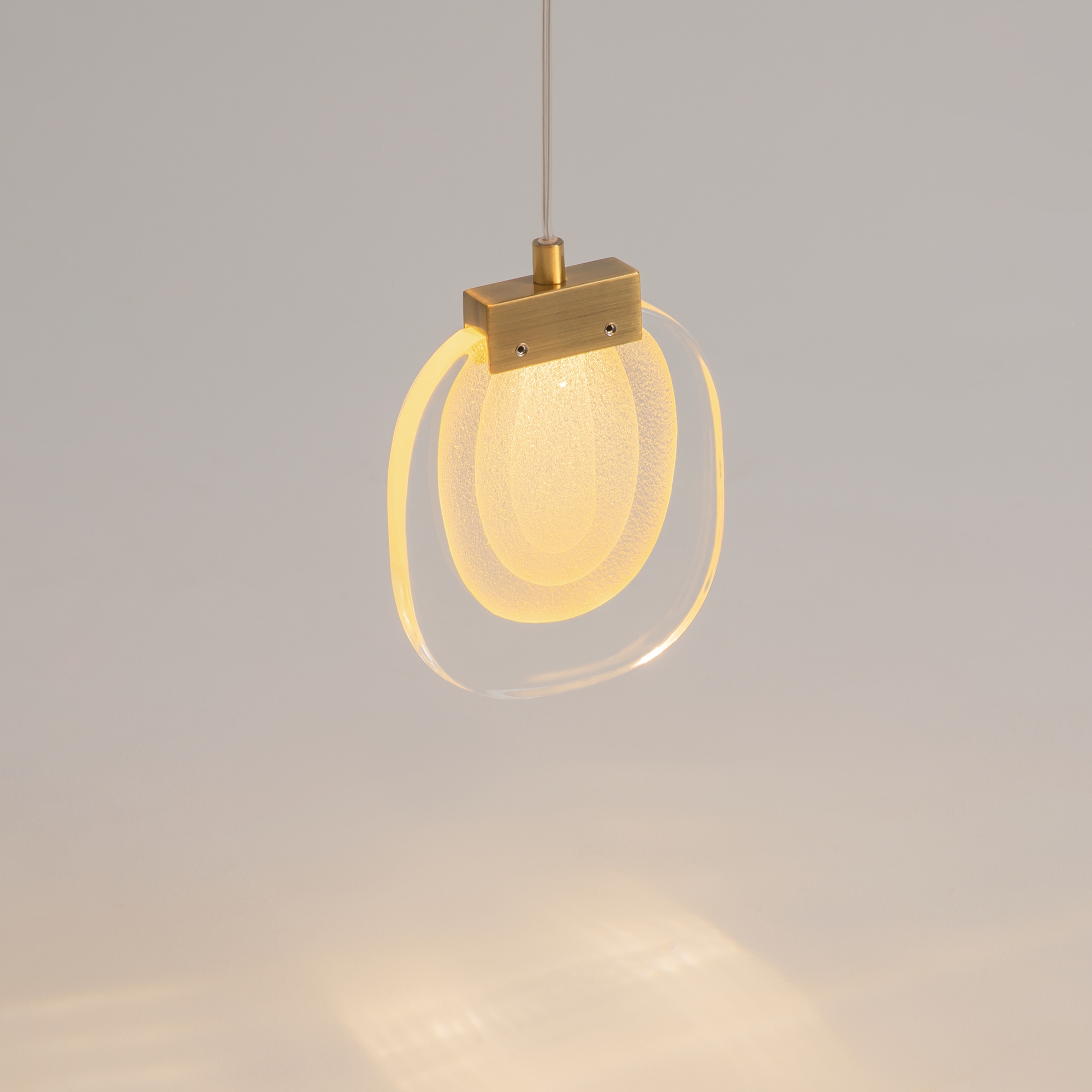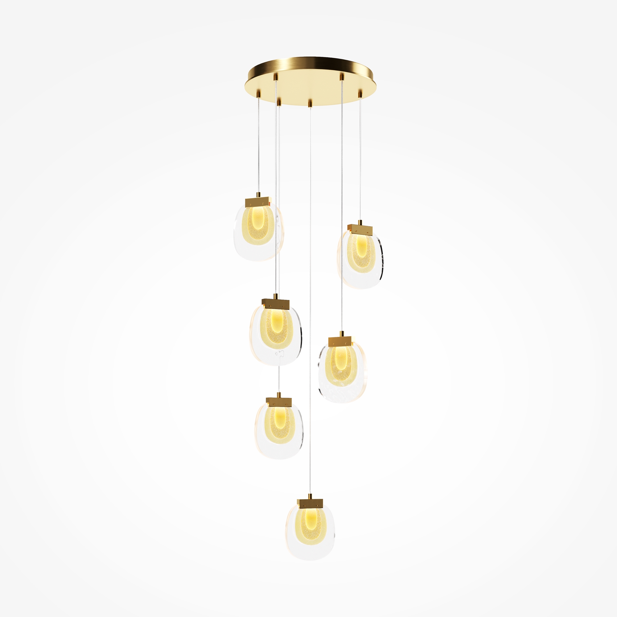 Цвет арматуры — латунь. Материал арматуры — металл. Подвесные светильники и бра. Цветовая температура 3000К. LED-источник света. Плафоны выполнены из прозрачного стекла, с акцентным многослойным рисунком. Регулируемая длина провода подвесных светильников до 3 метров, подходит для помещений с высокими потолками. Каскадная композиция на 9 плафонов оснащена проводом длиной 3,5 метра для эффектных дизайнерских решений. Специальная технология окрашивания литого стекла создает эффектный вид как при выключенном, так и при включенном свете.