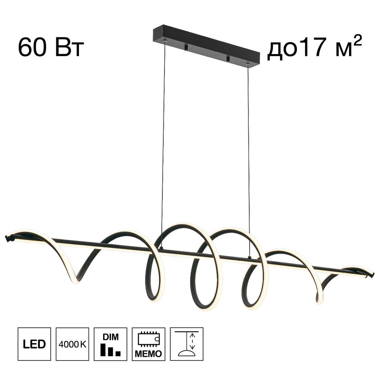 Каркас люстры — металлический, модного черного оттенка. На горизонтальной штанге расположен спиралевидный led-модуль с рассеивателем из оптического полимера. Длина светильника составляет 120см, мощность — 60Вт.