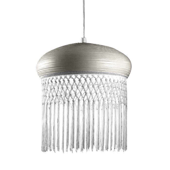 Подвесной светильник 7099/1-01 V1021 из коллекции Curtain на металлической арматуре. Плафон выполнен из металла серебряного цвета с белой бахромой. Высота светильника регулируется.