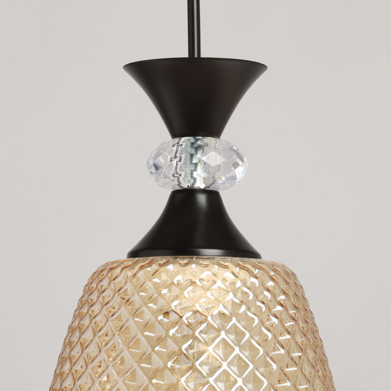 Металлическое основание окрашено в черный цвет. Традиционный источник света закрыт стеклянным фактурным плафоном, гальванизированным в цвет янтаря. Подвес декорирован прозрачным акрилом.