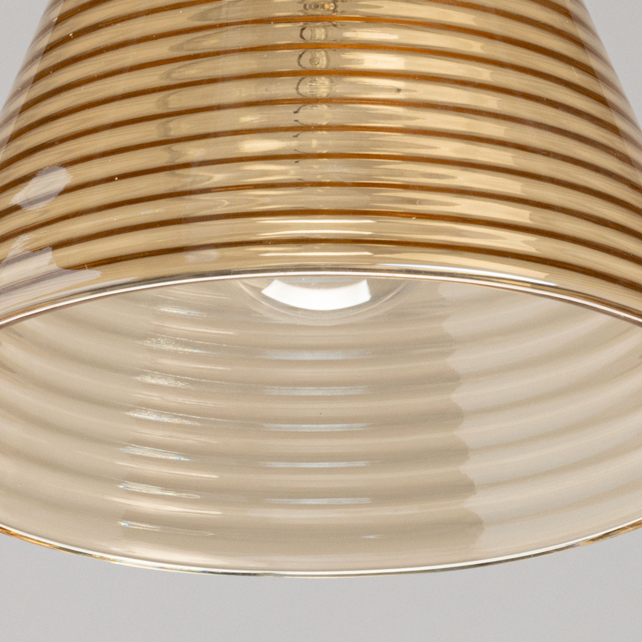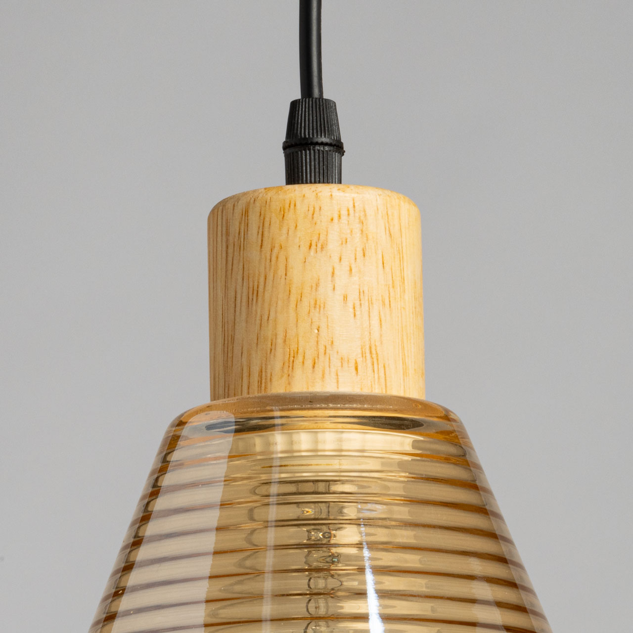 Основание подвеса выполнено из металла с имитацией под натуральное дерево светлого цвета. Стеклянный плафон, гальванизирован в цвет шампань с линейным рисунком отлит в форму.