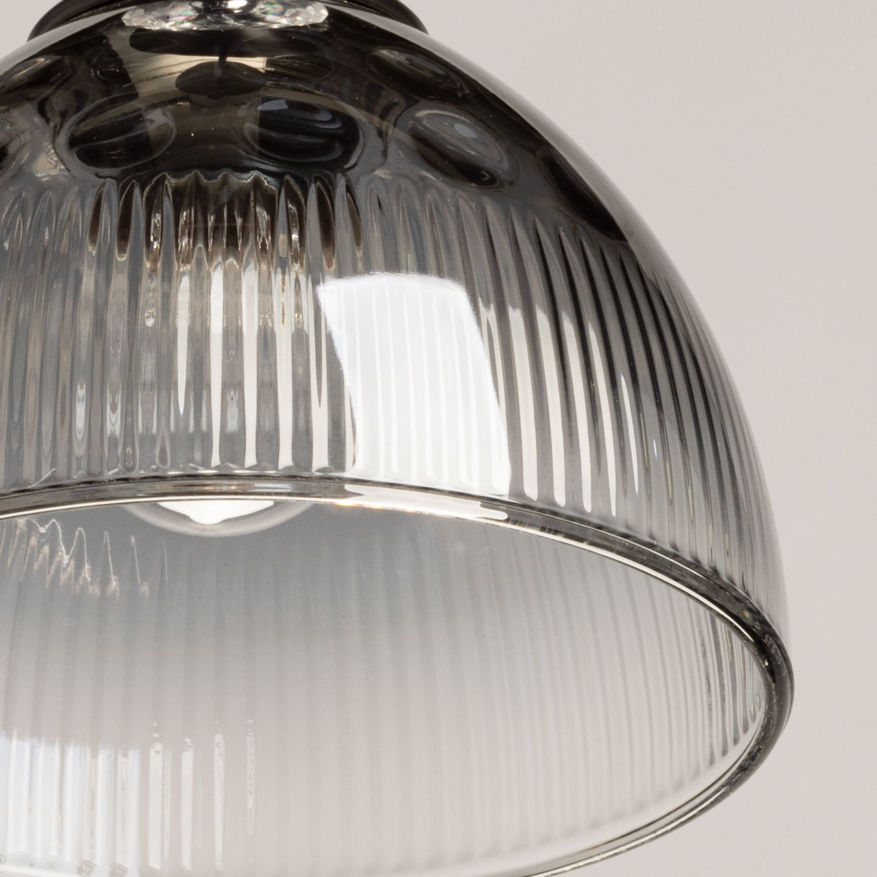 Металлическое основание светильника окрашено в черный цвет. Стеклянный плафон отлит в сложную форму и гальванизирован в дымчатый цвет с эффектом градиента от темного к светлому. Декоративный элемент на подвесе выполнен из акрила.