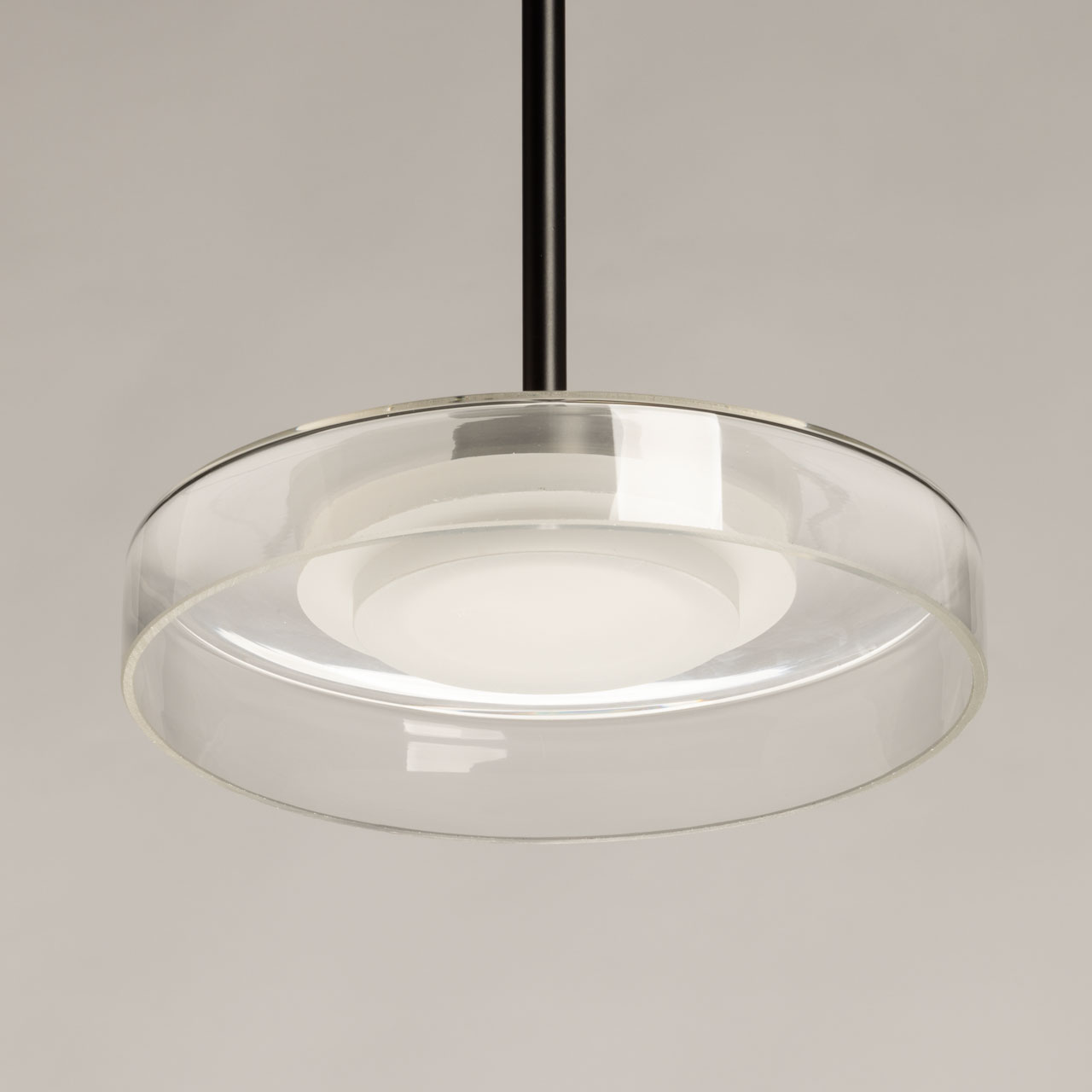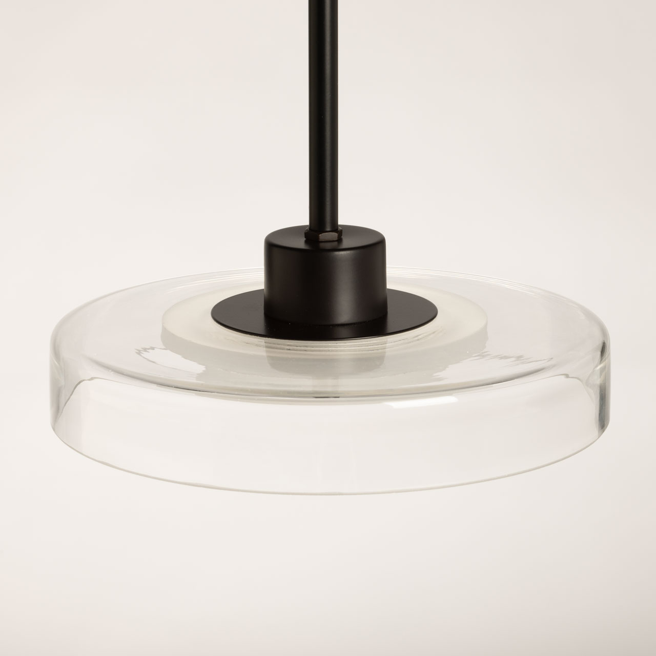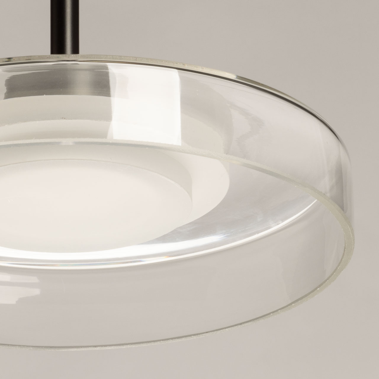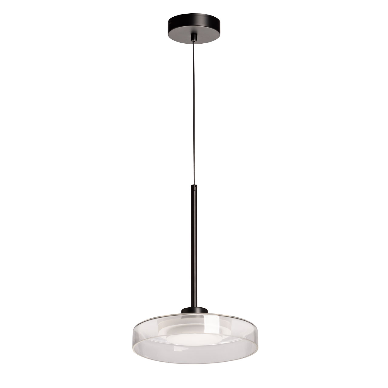 Металлическое основание светильника окрашено в черный цвет. Светодиодный источник света закрыт белым матовым акрилом. Люстра декорирована плафоном из прозрачного стекла.